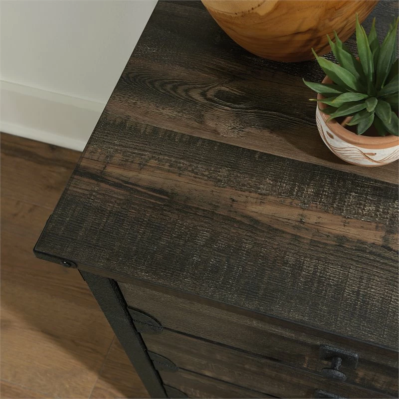 An anywhere credenza that could easily be used in the office, the living room, or the entryway. Does it exist? Luckily, yes! This credenza from the ® collection blends seamlessly into any space you need more storage. This storage credenza features three drawers with full extension slides for office or craft supplies, small tools, and more. The lower drawer of this industrial credenza holds letter or legal size hanging files—Say goodbye to the document clutter! This metal and wood credenza will keep all of your most important documents organized and secure with a file drawer lock. Open storage and display includes two adjustable shelves for customization of your credenza to your specific needs. These shelves are the perfect place for board games, home décor, and your favorite seasonal candles. This credenza with drawers is finished on all sides for versatile placement in any room of your home. A textured, powder coated metal frame with corner accents and a Carbon Oak® make this storage credenza the perfect addition to any part of your home.