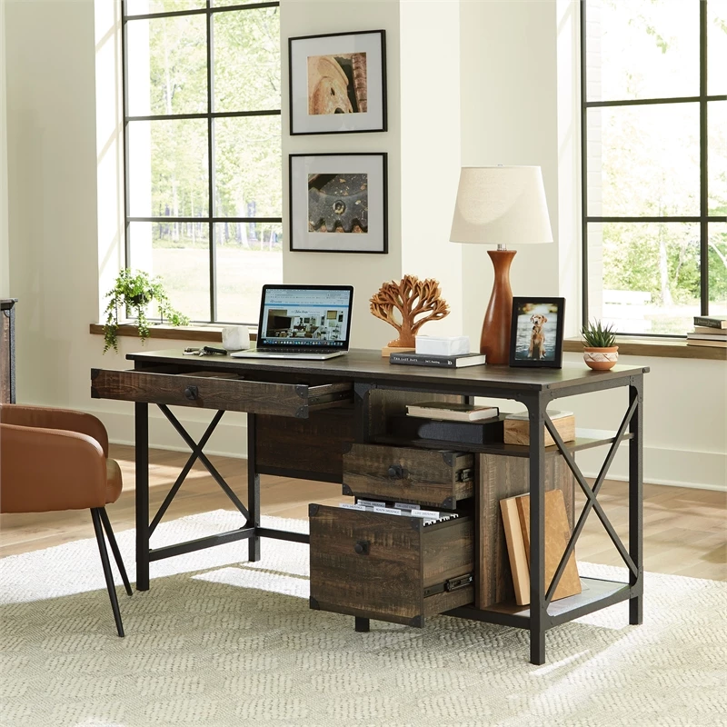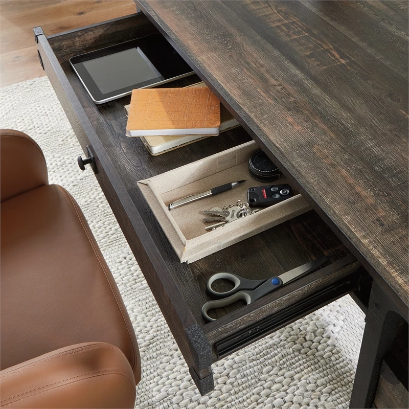 Create the perfect home office workspace with this computer desk from the ® collection. This computer desk with drawers features a spacious tabletop that provides you with room for all your office essentials – a computer monitor or laptop, your cup of pens and pencils, and colorful sticky notes. This industrial computer desk features three drawers with full extension slides. The wide pencil drawer underneath the top will store a laptop or other office supplies you want hidden away but close at hand. The lower drawer holds letter or European size hanging files. A dedicated storage area for a vertical CPU tower is the finishing touch on this computer desk with storage, perfect for gaming, work from home tasks, or general home office use. This home office desk is finished on all sides for versatile placement in any room of your home. The finishing touch of a textured, powder coated metal frame and corner accents set this desk apart. Finished in a Carbon Oak®, this practical computer desk is just what you need to get the job done.