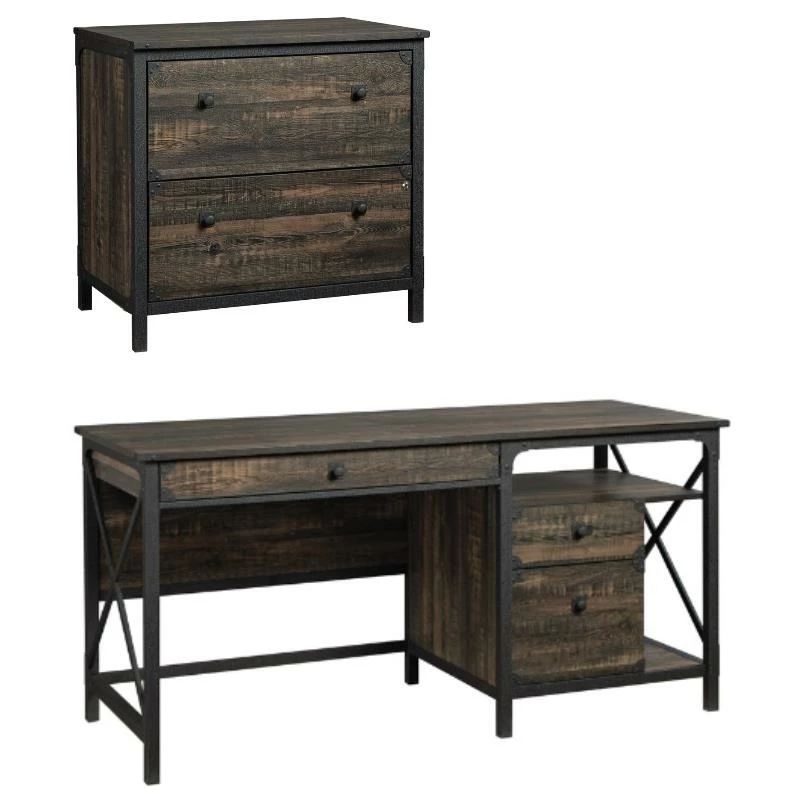 Keep your office or workspace organized and in style with this rustic lateral filing cabinet from the ® collection. This 2-drawer lateral file cabinet features two spacious file drawers that open and close on smooth full extension slides. Each drawer accommodates letter or legal-size hanging files so you can keep all your important files and papers organized and easily accessible. This industrial file cabinet also includes an interlocking safety mechanism that only allows one drawer to open at a time. Each drawer locks for secure storage of your most important files. A textured, powder coated metal frame and corner metal accents are the charming touches of design that make this wood lateral file cabinet stand out. This wood and metal lateral file cabinet is finished on all sides for versatile placement in any room of your home and looks great from any angle. Finished in Carbon Oak®, this simply stunning file cabinet with metal framing adds style and functionality to your office or workspace
