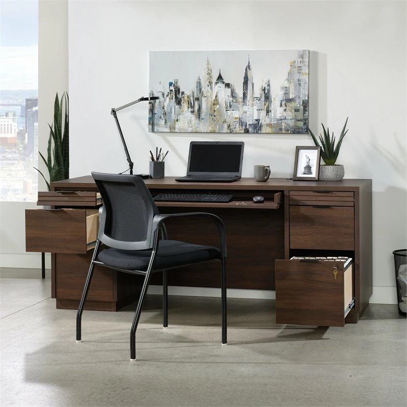 A credenza with all the commercial fixings. This credenza desk from the ™ collection comes with the pedestals and drawers pre-assembled so you can easily and quickly finish assembling assemble your new desk. This office credenza features a durable, 1″ thick top and end panels spacious enough for your printer, office décor, a lamp, and more. Featuring a melamine top surface that is heat, stain, and scratch resistant with impact resistant, high-grade thermoplastic edges for long-lasting durability, this office desk with storage is built to withstand the toughest of jobs. A drawer/shelf with metal runners and safety stops with a flip-down panel for laptop or keyboard/mouse allow you to utilize the top surface space for binders, planner, or a candle. Six drawers feature full extension slides with the lower drawers holding letter or legal size hanging files. The lower two drawers on each pedestal have a key lock for security. A cord management system featuring two desktop grommets keep your workspace clutter free. Finished on all sides for versatile placement, this commercial office furniture will look polished from every angle. With a Spiced Mahogany™ finish, this credenza will promote any office space.