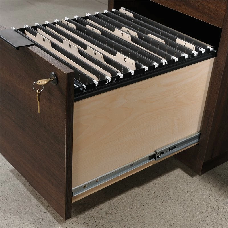 Mid-century style with 21st century function—This lateral file cabinet from the ™ collection ensures an organized office. This 2-drawer lateral file cabinet comes fully assembled, with minimal hardware attachment required so you can organize your office as quickly as possible. Durable, 1″ thick end panels and a 1″ thick top has enough room for books, office décor, and a lamp to makes this a commercial filing cabinet you can count on. This lateral file cabinet includes a melamine top surface that is heat, stain, and scratch resistant. Impact resistant, high-grade thermoplastic edges increase the durability and longevity of this commercial office storage item. Two drawers with full extension sides hold letter or legal size hanging files. This 2-drawer lateral file cabinet includes an interlocking safety mechanism that allows only one drawer to open at a time. You can guarantee the security of your most important documents with a key lock on this resimercial lateral filing cabinet. Commercial filing cabinets that are finished on all sides, like this one, allow for versatile placement and a polished look from every angle. Finished in Spiced Mahogany™, this lateral file will have your commercial office organized in no time.