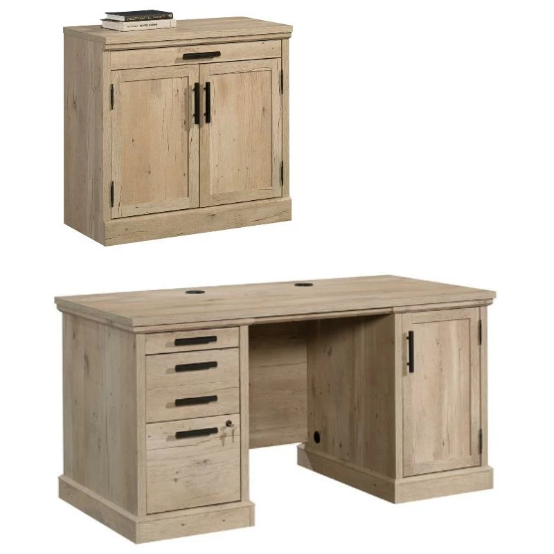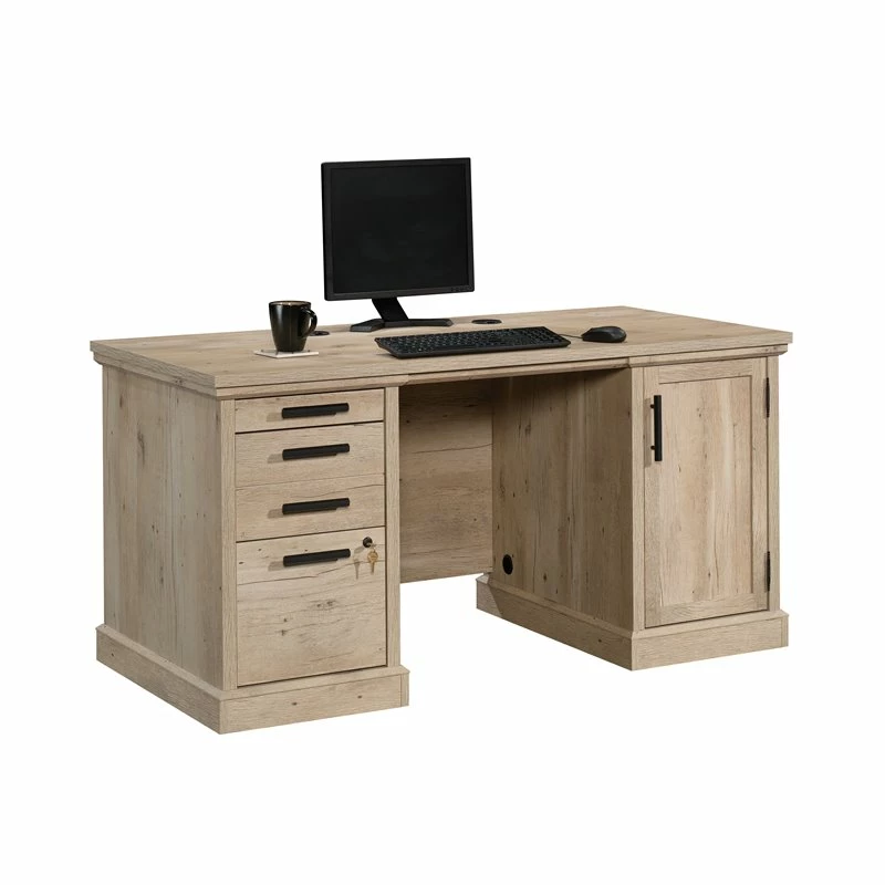 Bring a subtle, woodsy aesthetic and top-notch construction to your office. Stand out from your coworkers with this computer desk from the ™ collection. This unit comes with the pedestals and drawers pre-assembled to aide in the assembly process of your new desk. This double pedestal desk is fitted with a strong and lightweight, 1″ thick top with plenty of room for a computer, a lamp, your pens and pencils, as well as photos of your family. The melamine top surface is heat, stain, and scratch resistant, elevating this to commercial office desk standards. Three drawers feature full extension slides for ease of use as the file drawer and one storage drawer lock for security of your most important items. This computer desk with storage holds letter, legal, or European size hanging files. On the right side of this unit, behind a framed panel door is an adjustable shelf for storage of books, binders, and more. With cord management including desk top grommets, your resimercial desk has a place to tuck away electrical cords. This melamine desk is finished on all sides for versatile placement in any office – it will look polished from every angle. Finished in a light Prime Oak™, this wood office desk fits seamlessly into your office while adding a touch of a modern farmhouse aesthetic.