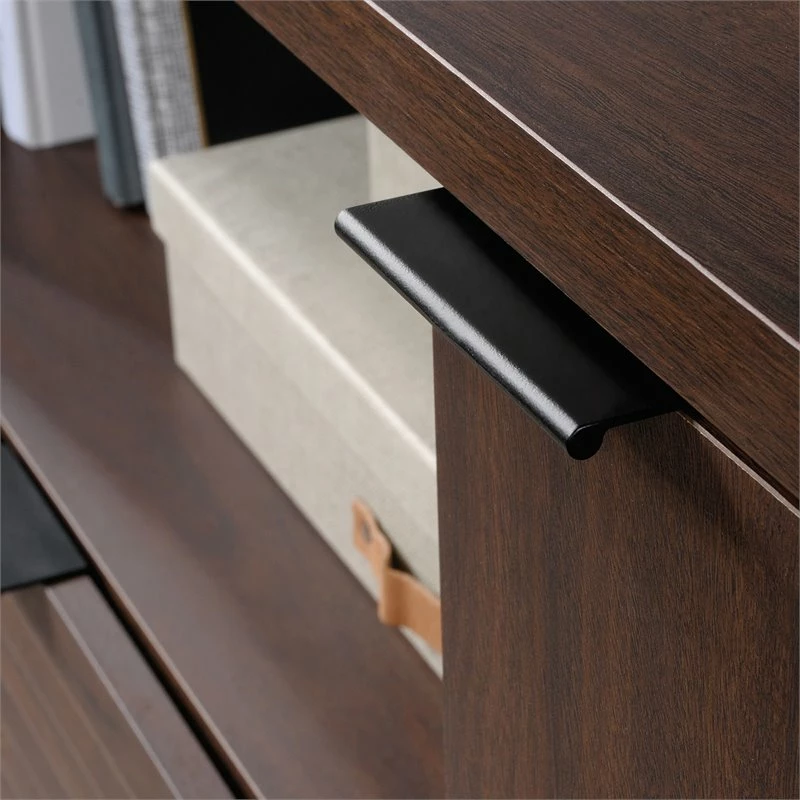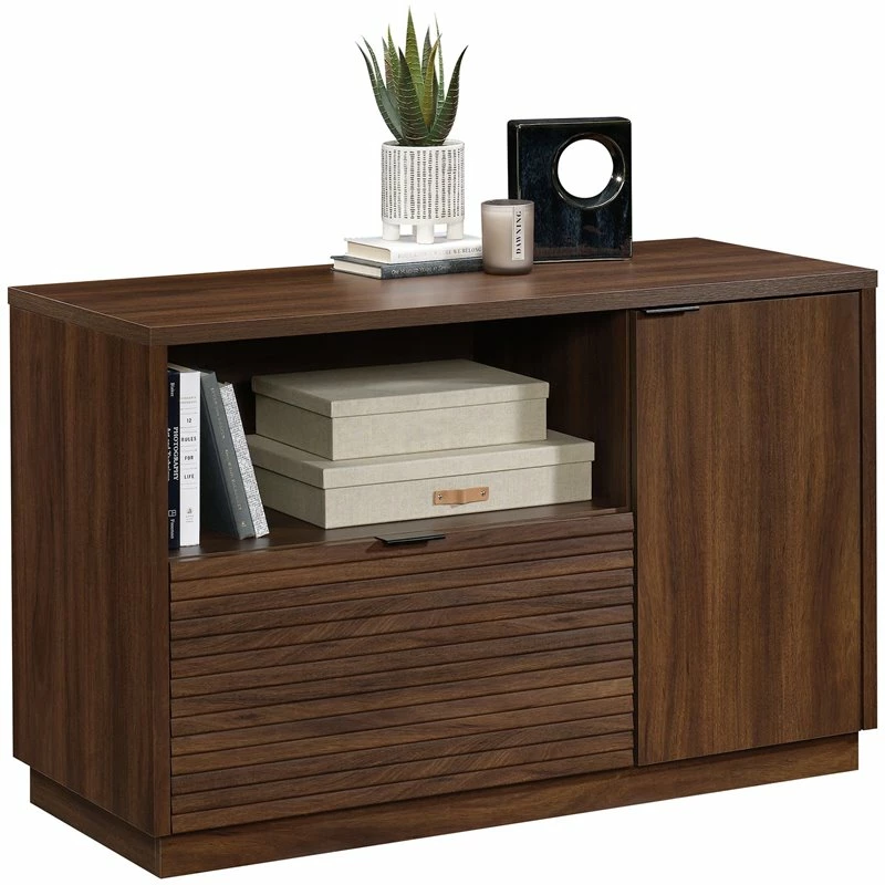 Is the lack of storage in your home office bringing you down? We can fix that! Create the additional storage options you need while adding the modern style that you love with this credenza from the ™ collection. This office credenza features a top surface with a strong and lightweight panel construction that provides you with space to store and display items like a wireless speaker, decorative plants, work binders, and framed photos. The open storage area provides you with the perfect space for easy access storage of binders and manuals or additional home décor. Behind the door is an adjustable shelf that can move to different heights to create flexible storage for items of all shapes and sizes. The lower file drawer with full extension slides can hold letter-size hanging files for increased organization. The drawer features louver details for an extra touch of style. Finished in Spiced Mahogany™, this stunning credenza is just what your home office is missing.