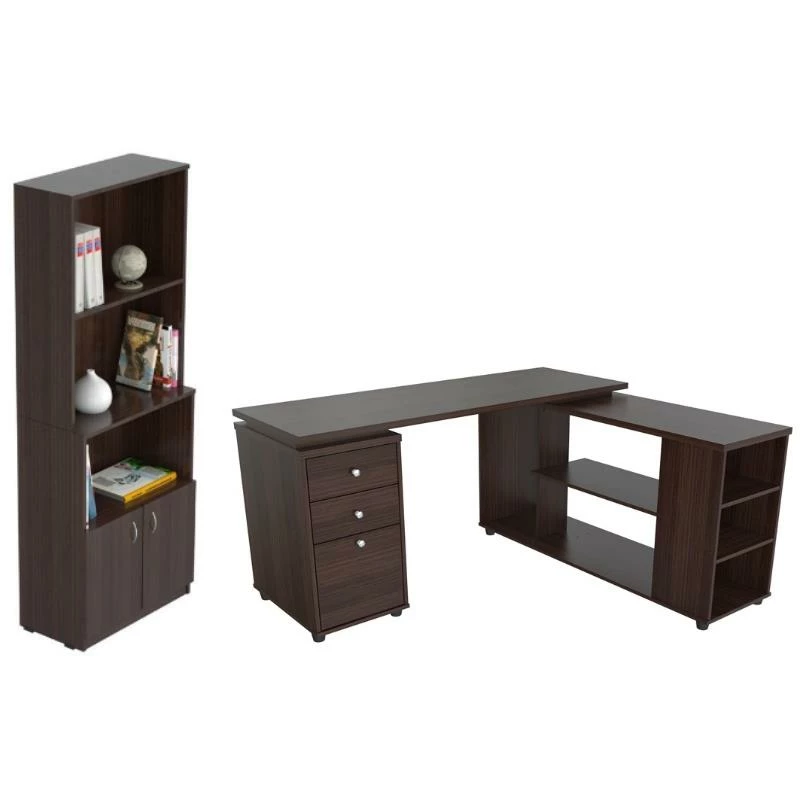 L Shaped Computer Desk finished in rich Espresso laminates in durable melamine which is stain, heat and scratch resistant. Constructed from manufactured wood, this corner computer desk offers a spacious work surface making it a perfect addition to any home office or office. It has a 1” top with 1.5mm edge banding and it can be assembled in a left or right configuration. It features one file drawer with full extension slides which accommodates letter or legal sized files, and two accessory drawers with brushed metal slides for storing supplies. All drawers have brushed metal knobs. The unit offers an ample work space, shelves for books, dedicated CPU storage, printer space and space for other accessories. Plastic sliders protect the unit and allow for easy mobility when cleaning or rearranging your room décor.