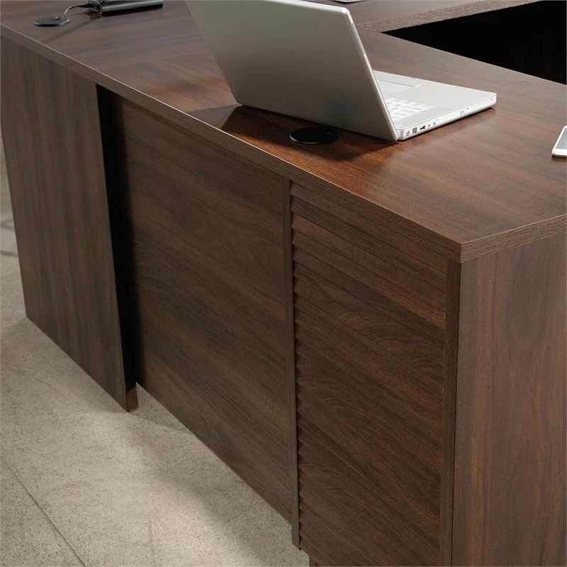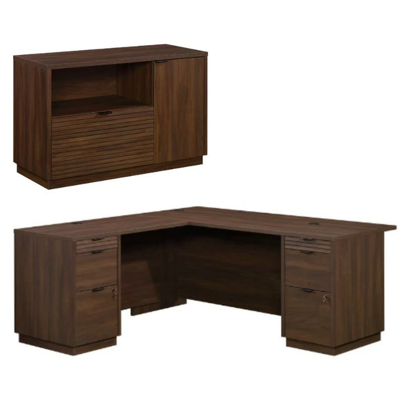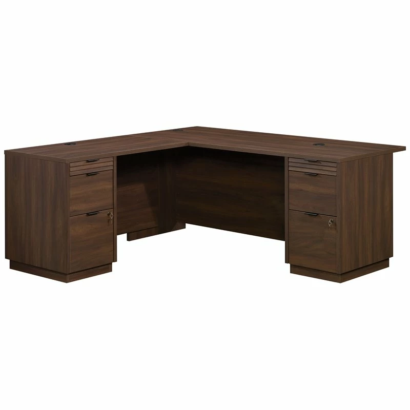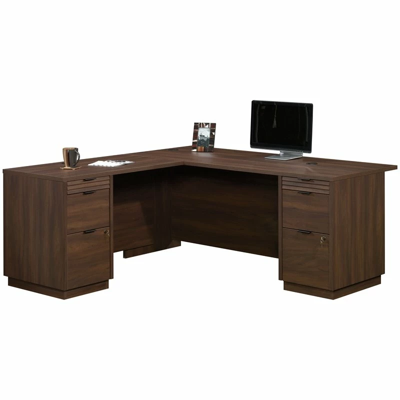 Bring on the toughest of workdays. You’ll be ready to face them with the L-shaped desk from the ™ collection. This L-shaped office desk comes with the pedestals and drawers pre-assembled, making your assembly process as easy as can be. A durable, 1″ thick top and end panels allow for a sturdy construction to hold your laptop, folders, a lamp, photos and more. The melamine top surface of this L-shaped desk is heat, stain, and scratch resistant and the impact resistant, high-grade thermoplastic edges add to the superior construction. All six drawers feature full extension slides while the lower drawers hold letter or legal size hanging files. The file drawer and middle drawer above on of this commercial office desk lock for security of your items. This resimercial desk is finished on all sides for versatile placement in your office and it looks polished from every angle. A cord management system including three desktop grommet holes keep your commercial office furniture free of cord clutter. Finished in Spiced Mahogany™, this L-shaped desk brings together function and design for one beautiful piece.