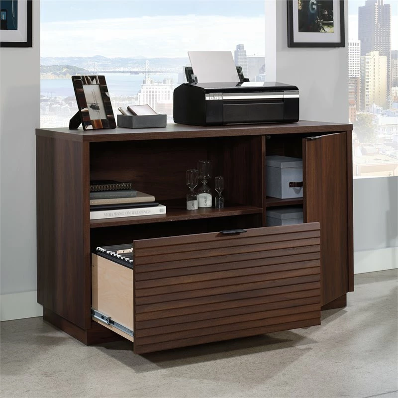 A file credenza must have a variety of storage space. And it’s a bonus when it’s super stylish too. This office storage cabinet from the ™ collection catches the eye with vertical woodgrain and horizontal slatting. A durable 1″ thick top and end panels make the surface sturdy for a printer, lamp, books, plants, and more. The melamine top surface is heat, stain, and scratch resistant with impact resistant, high-grade thermoplastic edges. This office storage credenza features an adjustable shelf behind storage door to accommodate items of various heights. A spacious file drawer with full extension slides conveniently holds letter-size hanging files so all your documents are organized and easy to find in this resimercial credenza. Get to work as quick as possible with easy assembly featuring a T-lock drawer system. Finished in a Spiced Mahogany™, this commercial office storage increases display space in a stylish way.