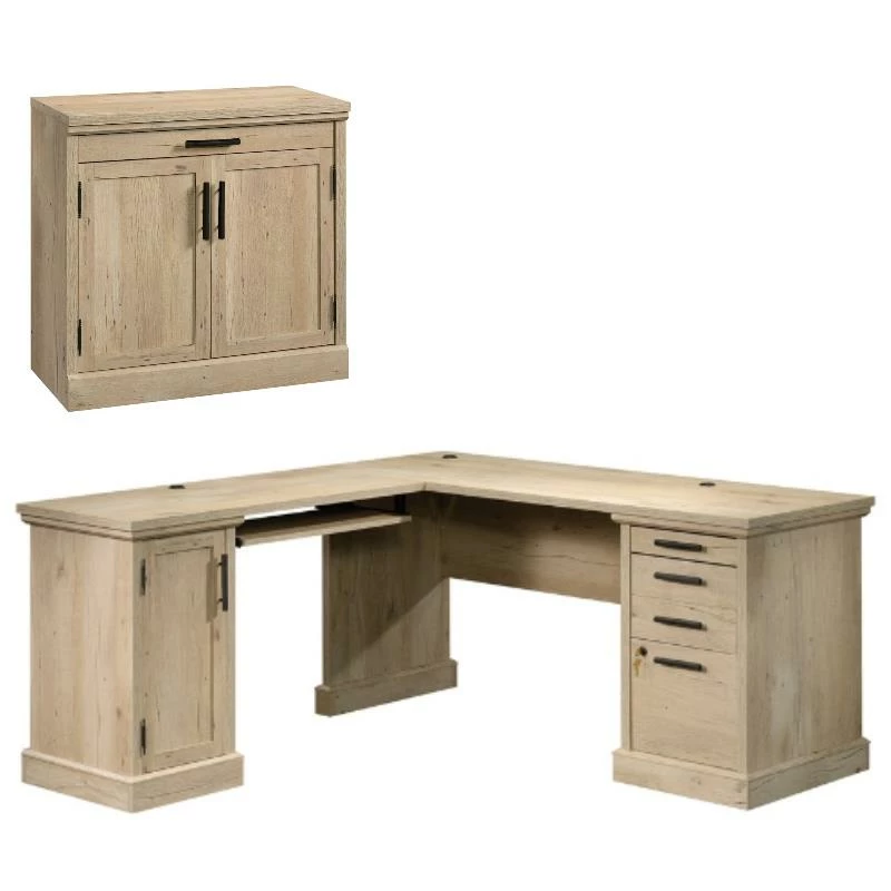 We desire a lot from a home office desk. Thankfully, the L-Shaped Desk from the ™ collection offers what you need—and tons more! This home office desk features a slide out shelf for your keyboard and mouse which keeps the top surface free to display photos of your family, to do lists, and your favorite pens. The under desk keyboard shelf features metal runners and safety stops that can be fastened in three different positions. Storage is not a problem with this L-shaped computer desk as it features three drawers with full extension slides. The lower drawer of this office desk with storage holds letter or legal size hanging files and includes a lock for security to keep your documents organized and easy to find. There is room for additional storage with an adjustable shelf and a vertical CPU tower behind the door. Your cords will never be unorganized again with the desktop grommets that this home office desk offers. If cords aren’t your thing, this desk accommodates optional Hidden Wireless Qi Charger. To get you settled into your new desk as quick as possible, this item features quick and easy assembly with patented T-lock drawer system. This item is finished on all sides, so it can look good however you arrange it in your home! Finished in Prime Oak™, this multifunctional L-shaped desk checks every box you could think of. And it looks great while doing it.