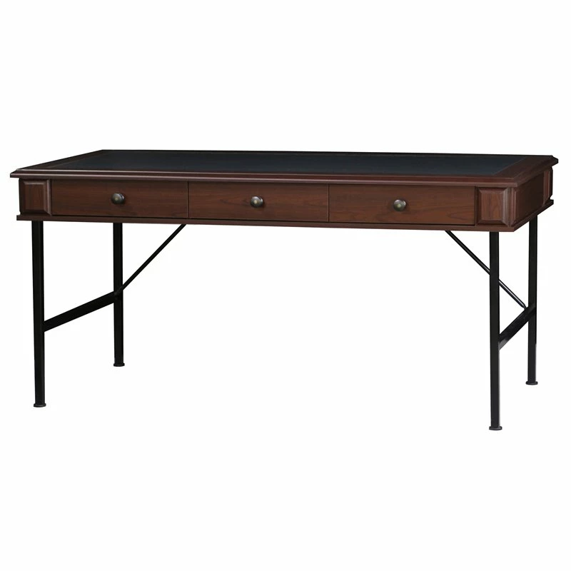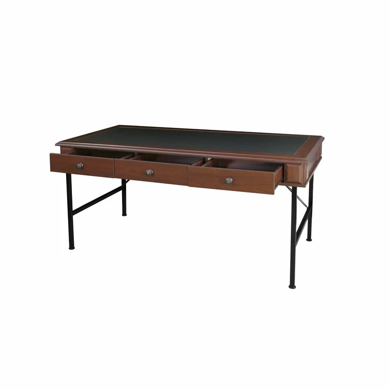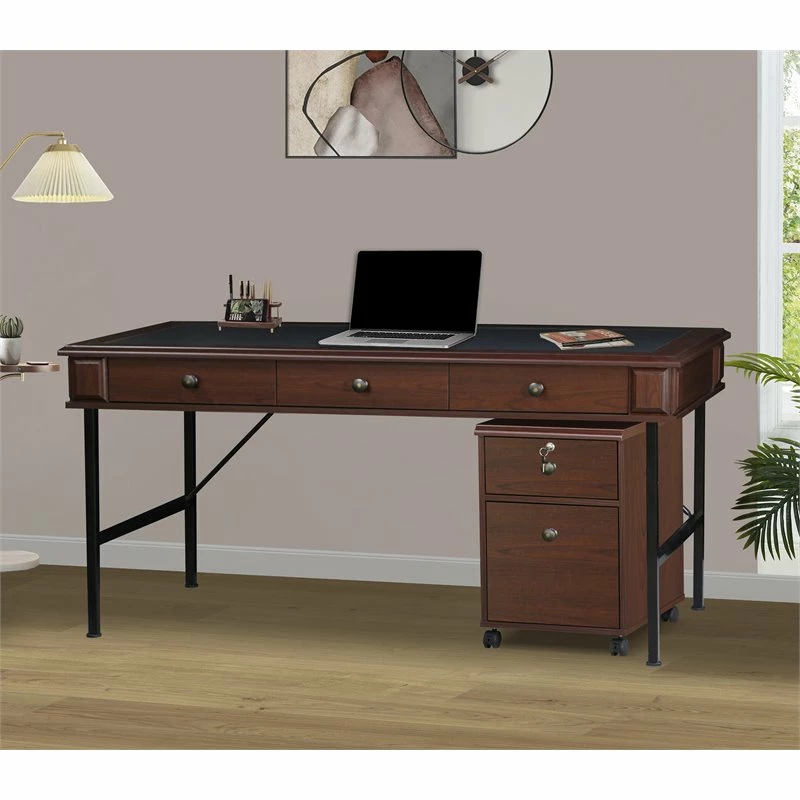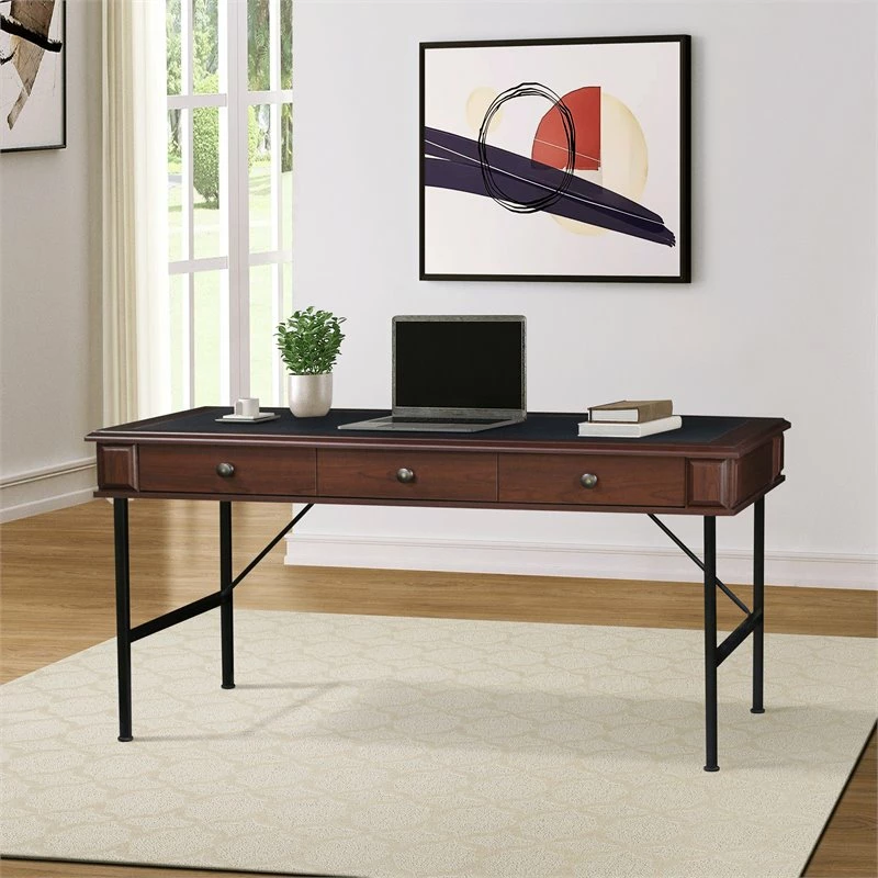 Incorporate this tasteful writing desk in a modern living space and make task-mastering a breeze. A rich cherry finish adds a refined, sophisticated ambiance perfect for complementing a complete living space. Black finish metal legs add a bit of farmhouse inspiration. Find space in drawers to accommodate papers and accessories, as a wide desktop makes room for extra incidentals.