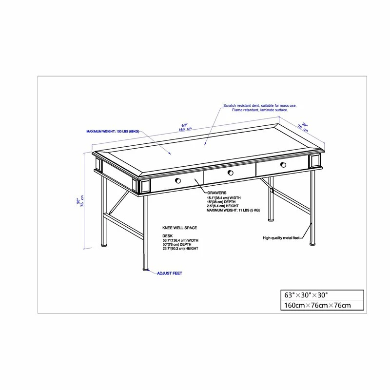 - Desk Dimensions : 30″H x 30″W x 63″D