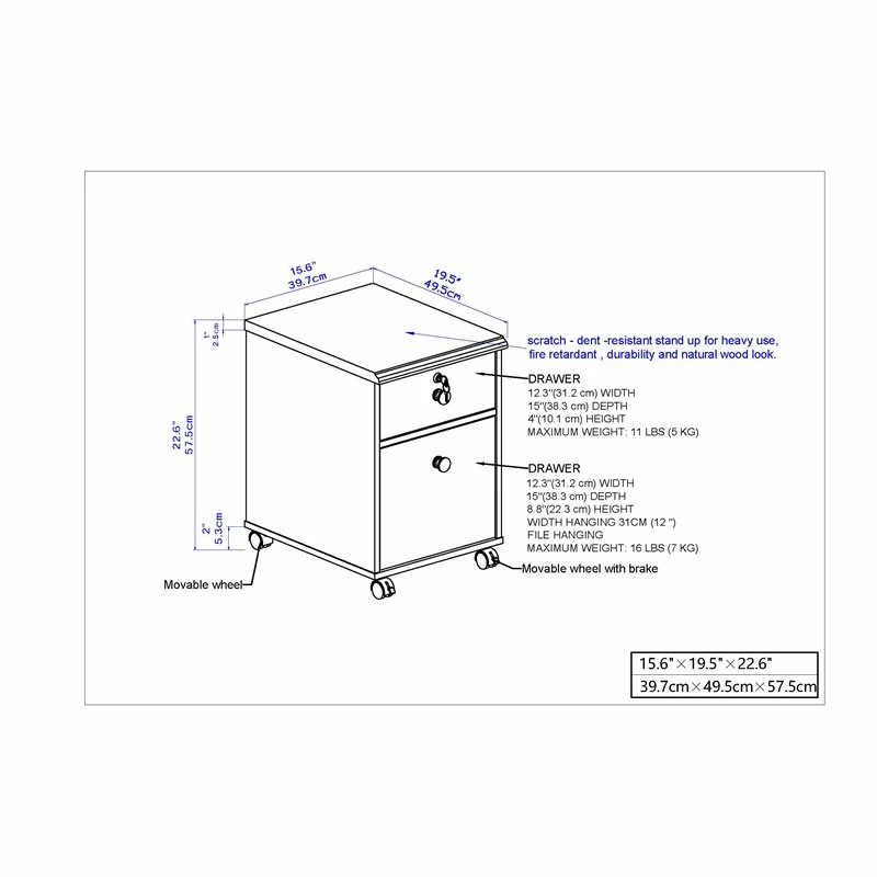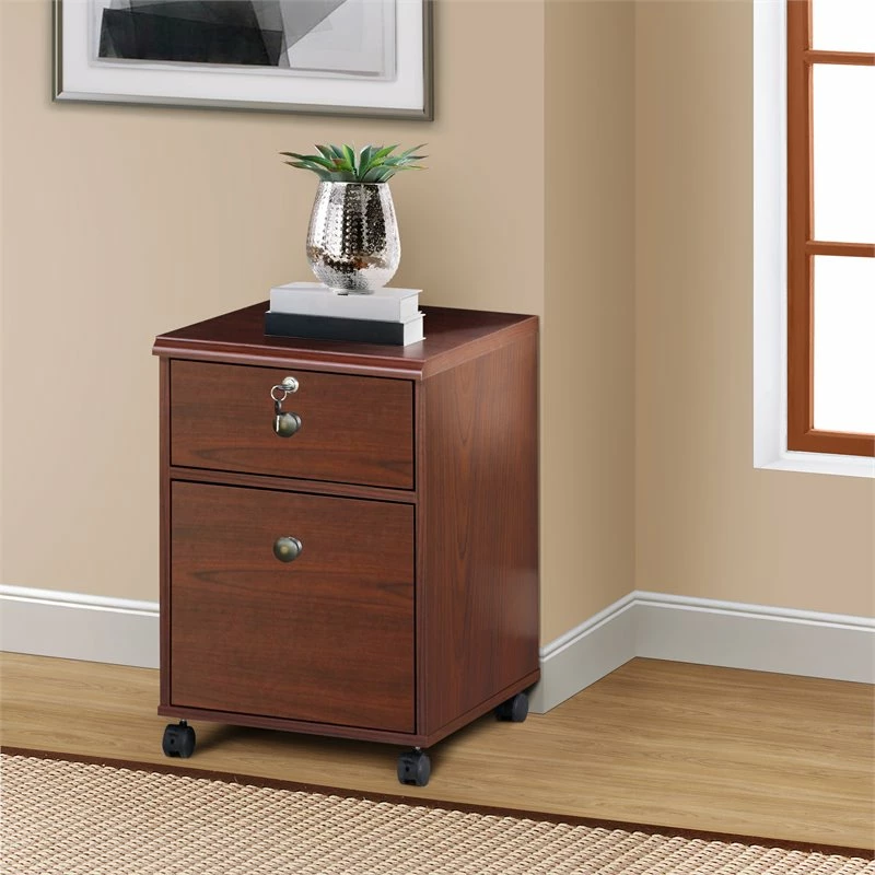 Rich with a cherry finish, this mobile file cabinet offers a decorative bonus to home or business office spaces. Take filing to the next level with a bottom drawer that accommodates letter and legal-size file folders and a locking top drawer to keep valuables secure. A contemporary design reflects sophisticated clean lines. Double-caster wheels allow movement for extra accessibility.