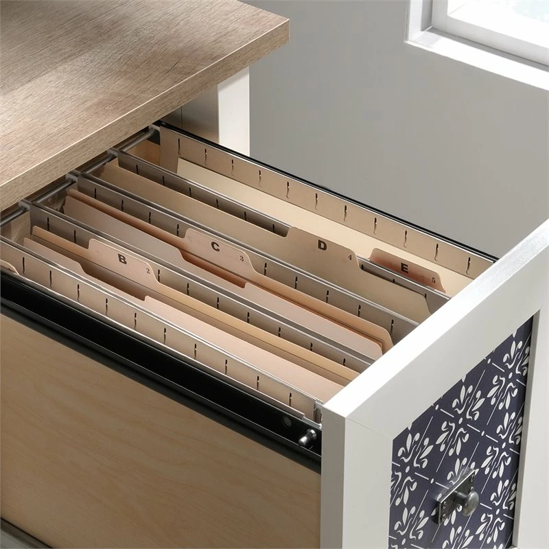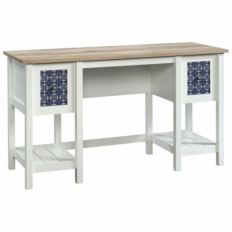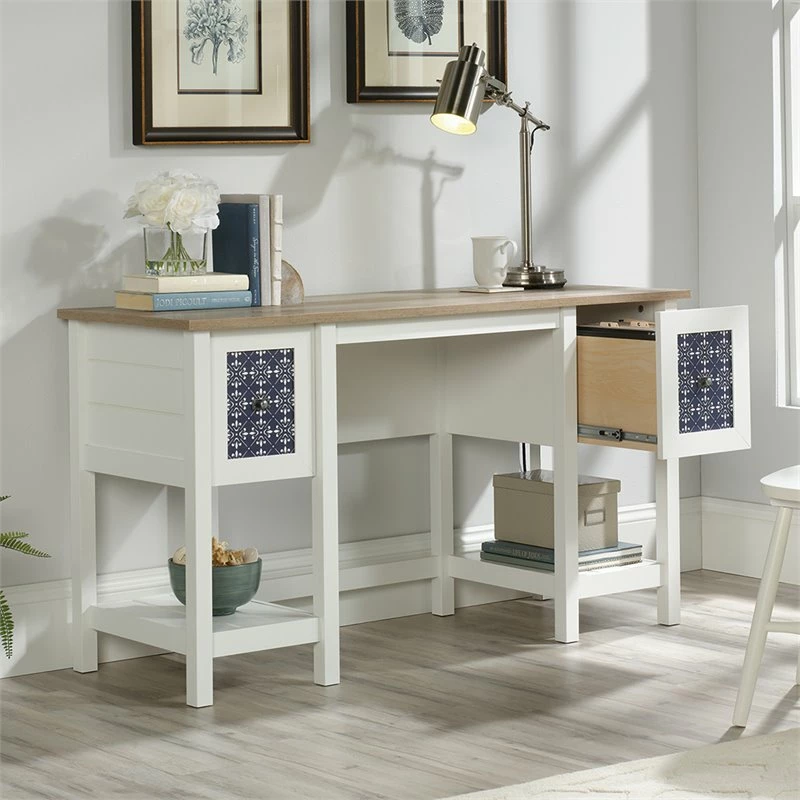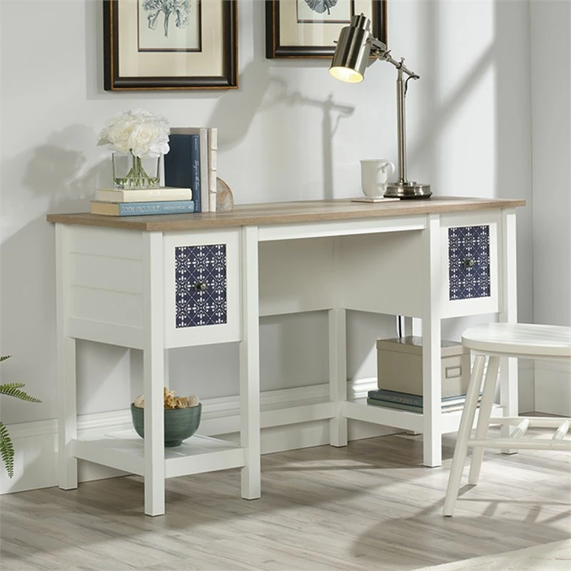 Searching for a little extra motivation? Updating your home office space can do just the trick! Give your home office or work space the style upgrade it needs when you add the charming style and design of this desk from the Home Square collection. This computer desk offers a spacious top surface that provides you with all the room you need for must-have desk essentials like your laptop, stacks of notepads, your collection of pens, and your hot cup of coffee. This home office desk features two drawers with full extension slides for easy access storage. The file drawer can hold letter-size hanging files so you can keep all your documents organized. Each drawer front features a decorative tile pattern for an extra touch of detail that is sure to stand out. This white computer desk also includes two lower shelves for additional storage of miscellaneous items. Finished on all sides in Soft White with Lintel Oak accents, this beautiful computer desk will have you feeling ready to work.