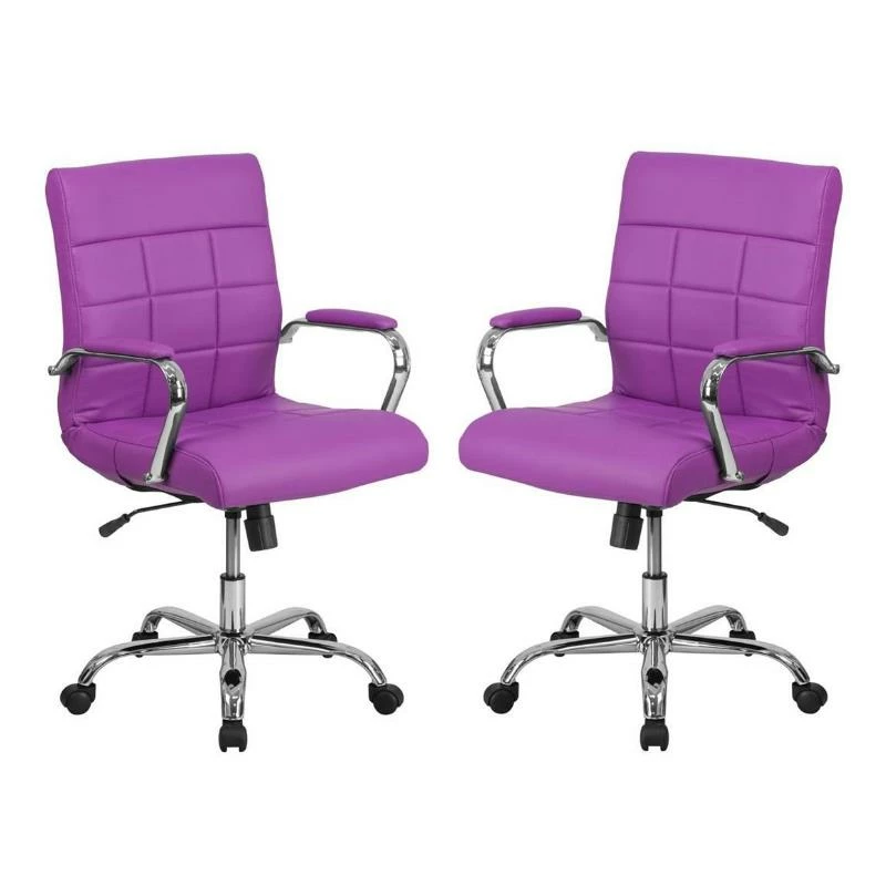 Brighten up your work space with this contemporary mid-back purple vinyl executive swivel office chair featuring designer quilted upholstery. This chair will not disappoint with adequate cushioning to keep you comfortable. The mid-back office chair offers support to the mid-to-upper back region. This chair is ideal for anyone who does a great deal of typing throughout the day and needs good back support. The tilt lock mechanism offers a comfortable rocking/reclining motion. The free rein motion is great for taking a quick break from typing to answer phone calls and relax. The waterfall front seat edge removes pressure from the lower legs and improves circulation. Chair easily swivels 360 degrees to get the maximum use of your workspace without strain. The pneumatic adjustment lever will allow you to easily adjust the seat to your desired height. The chrome base adds a stylish look to complement a contemporary office space.