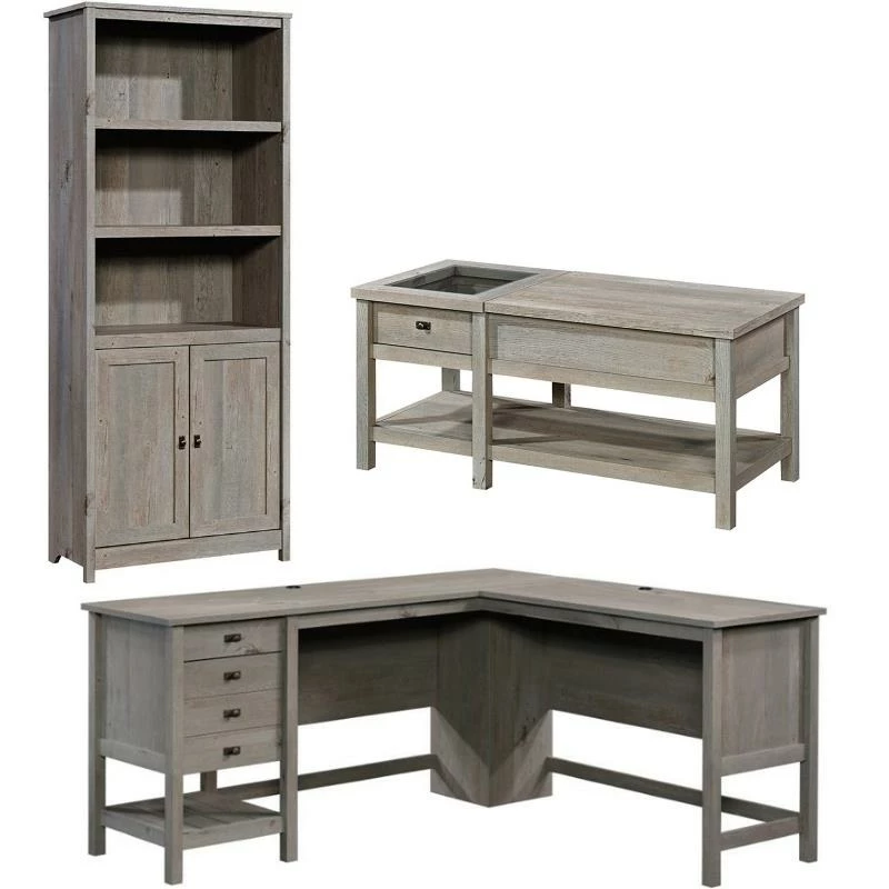 Update your home office with this L-shaped desk from the Home Square® collection. The spacious work surface of this home office desk has room for your computer, pens, binders, folders and a little home décor. Two drawers feature full extension slides for desk essentials and convenient storage options. The lower drawer holds letter-size hanging files, so your important documents are never hard to find. This L-shaped office desk features a lower, open shelf for additional storage of books or an organizing bin. A tidy workspace is crucial, that’s why this wood L-shaped desk comes equipped with two desktop grommets to keep your home office clutter free of electronic cords. This farmhouse style wood computer desk is finished on all sides for versatile placement in any room of your home. This allows you to rearrange and revamp as often as you want—your desk will look good from every angle. Finished in Mystic Oak®, this L-shaped desk with storage breathes new life into and new meaning into the home office.