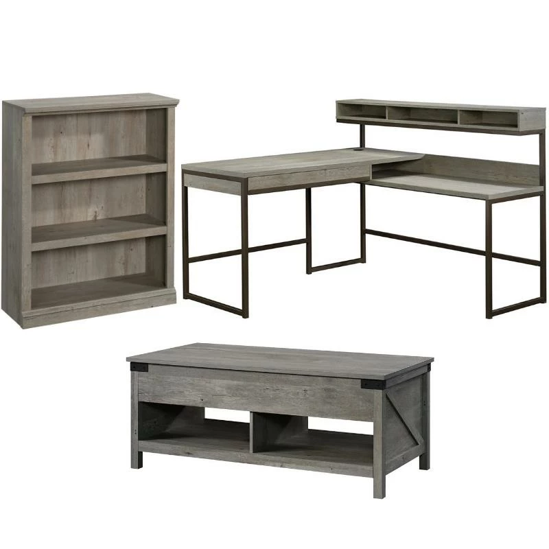 Your office desk should be just a stylish as you are. Upgrade the look of your home workspace with the sophisticated style and elegant design of this L-shaped desk from the Manhattan Gate collection. Its spacious L-shaped top surface provides you with all the room you need for your must-have desk essentials like your laptop, work binders, notepads, and your coffee mug. You can even find a place for home décor items like decorative plants and picture frames. This corner writing desk features a storage drawer that opens and closes on smooth metal runners for convenient storage of miscellaneous supplies. It also features an elevated shelf with cubbyhole storage for easy access of items like envelopes and folders. This home office writing desk is finished on all sides for versatile placement throughout your home. It features a strong and lightweight 1” panel construction along with a powder coated metal frame. Finished in mystic oak, this handsome corner work station is just what your home is missing.