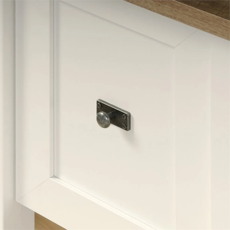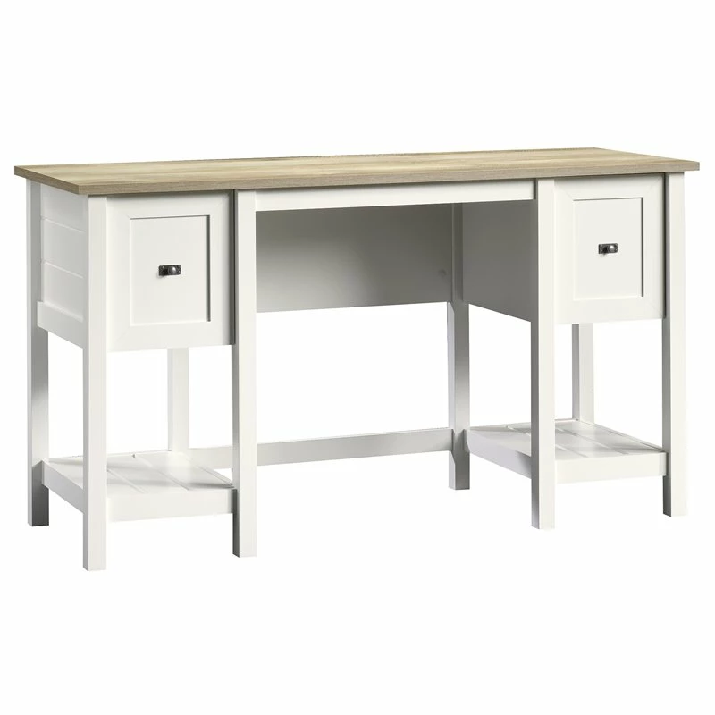 Clean, elegant, and bright. Transform your office space with this desk from the Home Square® collection. The spacious table top surface of this home office desk offers ample amount of room for all your must-have office essentials – laptop, collection of notepads, a cup full of pens, and of course your favorite coffee mug. This small office desk features two spacious storage drawers that open and close on full extension slides. Each drawer is detailed with framed panels to add an extra touch of charm. Keep all your important documents and papers organized in the file drawer that accommodates letter-size hanging files. This beautiful home office desk with storage also includes two lower open shelves with slat panel detailing to give it that casual cottage style. These shelves work great for additional storage space of any other office or home essentials. This computer desk is finished on all sides in Soft White® with a Lintel Oak® accent. This desk with storage will have you feeling motivated and ready to work!