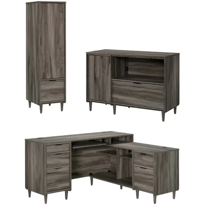 Cubby storage as far as the eye can see! Never run out of convenient storage and workspace with this L-shaped desk from the ® collection. This L-shaped office desk includes a slide-out keyboard/mouse shelf with metal runners and safety stops to keep your generous top surface space clear for items like a laptop, lamp, photos of your family and more. Two larger bottom drawers with full extension slides hold letter-size hanging files, so your important documents are never lost again. This L-shaped home office desk includes three storage drawers with metal runners and safety stops to store items like pens, sticky notes, letter openers, and more. The desk return can be fastened to either the left or right side, making mid-century modern desks like this one, adaptable for your home. Cord clutter is never a problem because this L-shaped desk with drawers includes grommet holes and pass-throughs for easy cord managements. Finished on all sides for versatile placement, this L-shaped desk with storage looks polished from every angle. Cubbyhole storage and solid wood feet are just some extras that make this home office desk unique and eye catching. With a Jet Acacia™ finish, this L-shaped desk adds a cool touch to your home.