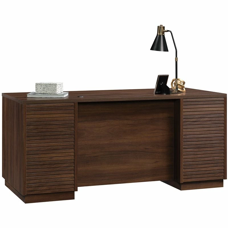 Is your home office or workspace in need of an upgrade? Add the elegant style and classic design of this executive desk from the ® collection. Its spacious table top surface provides you with ample room for all your must-have desk supplies like your laptop, a cup full of pens and pencils, and even a little room for some home décor items too. It features two small storage drawers that open and close on smooth metal runners for easy access storage of miscellaneous items like a stapler, envelopes and paper clips. It also includes large file drawers with full extension slides that can hold letter, legal size hanging files so you can be organized to the max. The file drawer on the left side includes a key lock so you can keep important documents safe and secure. It also features grommet holes in the desk top for cord management. Finished in Spiced Mahogany™, this beautiful executive desk will have you feeling motivated to get the job done.