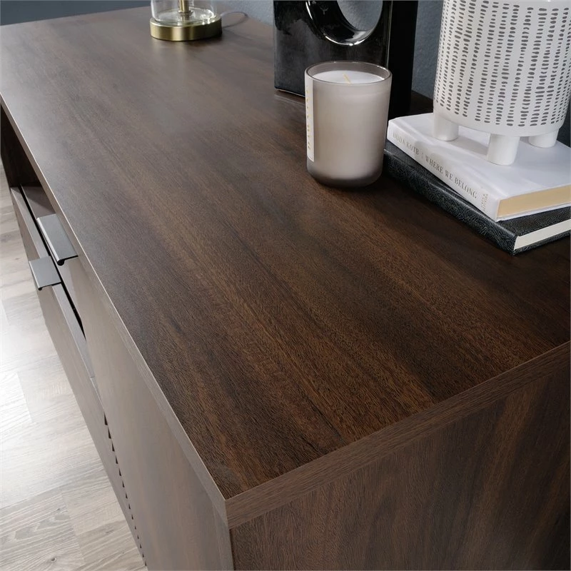 Is the lack of storage in your home office bringing you down? We can fix that! Create the additional storage options you need while adding the modern style that you love with this credenza from the ™ collection. This office credenza features a top surface with a strong and lightweight panel construction that provides you with space to store and display items like a wireless speaker, decorative plants, work binders, and framed photos. The open storage area provides you with the perfect space for easy access storage of binders and manuals or additional home décor. Behind the door is an adjustable shelf that can move to different heights to create flexible storage for items of all shapes and sizes. The lower file drawer with full extension slides can hold letter-size hanging files for increased organization. The drawer features louver details for an extra touch of style. Finished in Spiced Mahogany™, this stunning credenza is just what your home office is missing.
