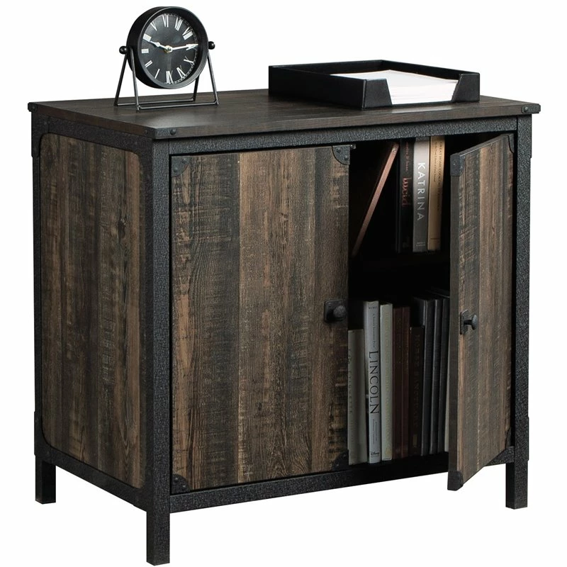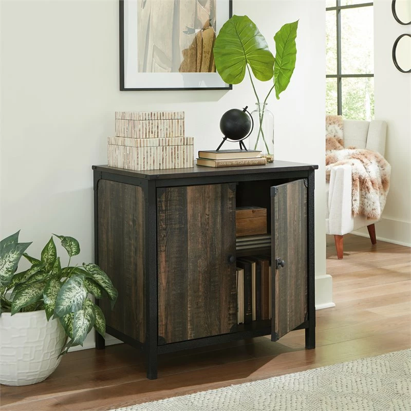 Transform your home into a rustic-inspired retreat with this library base from the ® collection. This beautiful library base cabinet features a spacious surface to display all your favorite home décor or office essentials like binders, folders, and a lamp. Behind the double doors of this 2 door base cabinet is a hidden storage area that includes a spacious adjustable shelf for convenient storage and organization of books, office supplies, and more. A textured, powder coated metal frame and corner accents elevate this library cabinet above the rest. Finished on all sides for versatile placement in any room of your home, this industrial storage cabinet will look great from every angle. This 2 door storage cabinet adds beautiful style and desired functionality to any room in your home – dining room, office, living room, or even the bedroom! Finished in Carbon Oak® and accented with stunning hardware, this library base storage cabinet is the solution to all your storage woes.
