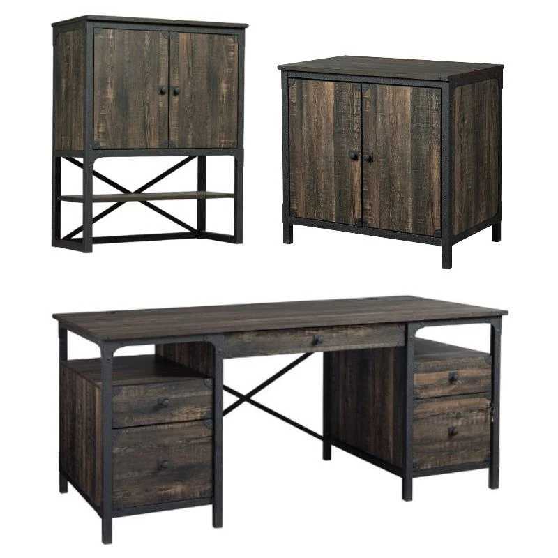 Who said you can’t have style in the workplace? Give your home office or workspace the update it deserves with this executive desk from the ® collection. This computer desk with drawers has a top surface that provides you with ample room for all your must-have desk supplies like your laptop, collection of notepads, your cup of coffee and even an accent lamp. This home office desk features five storage drawers with full extension slides for pens, charging cords, or sticky notes. The two lower drawers hold letter or legal size hanging files so you can keep all your important files organized. Safely secure the right-side file drawer with a key lock. This computer desk with storage also features two open shelves on each side for additional storage of items like stacks of books, organizing bins and maybe even a couple home décor items. A cord management system, including two desk top grommets, help keep your workspace clutter free. This industrial desk is finished on all sides for versatile placement in any room of your home: It looks great from any angle! Finished in Carbon Oak® and detailed with a textured, powder coated metal frame and corner accents, this beautiful wood home office desk is just what your home has always needed.