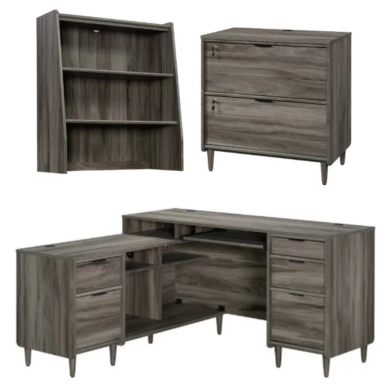 Cubby storage as far as the eye can see! Never run out of convenient storage and workspace with this L-shaped desk from the ® collection. This L-shaped office desk includes a slide-out keyboard/mouse shelf with metal runners and safety stops to keep your generous top surface space clear for items like a laptop, lamp, photos of your family and more. Two larger bottom drawers with full extension slides hold letter-size hanging files, so your important documents are never lost again. This L-shaped home office desk includes three storage drawers with metal runners and safety stops to store items like pens, sticky notes, letter openers, and more. The desk return can be fastened to either the left or right side, making mid-century modern desks like this one, adaptable for your home. Cord clutter is never a problem because this L-shaped desk with drawers includes grommet holes and pass-throughs for easy cord managements. Finished on all sides for versatile placement, this L-shaped desk with storage looks polished from every angle. Cubbyhole storage and solid wood feet are just some extras that make this home office desk unique and eye catching. With a Jet Acacia™ finish, this L-shaped desk adds a cool touch to your home.