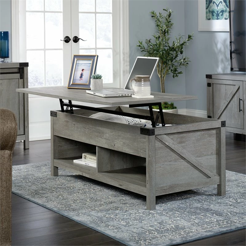 Nothing says stylish modern farmhouse aesthetics like a cool toned living room. With this lift-top coffee table from the Home Squareâ„¢ collection, your home is upgraded while still remaining the place you know and love. This wood lift-top coffee table features a spacious top surface that lifts up and toward you to create a multipurpose space in your living room. With this pop-up coffee table, you can work from your laptop or enjoy a delicious dinner– all while relaxing from the seat of your own sofa. Beneath the lift-top of this farmhouse coffee table is a hidden storage area that is perfect for storing books, a deck of cards, remotes, and blankets. The lower open shelf provides you with additional storage space for items like magazines, organizing bins, and extra candles. This wood top coffee table is finished on all sides for versatile placement throughout your home and looks polished from any angle. Finished in Mystic Oak® and detailed with attractive hardware, this coffee table with lift-top brings you into the future without forgetting about the past.