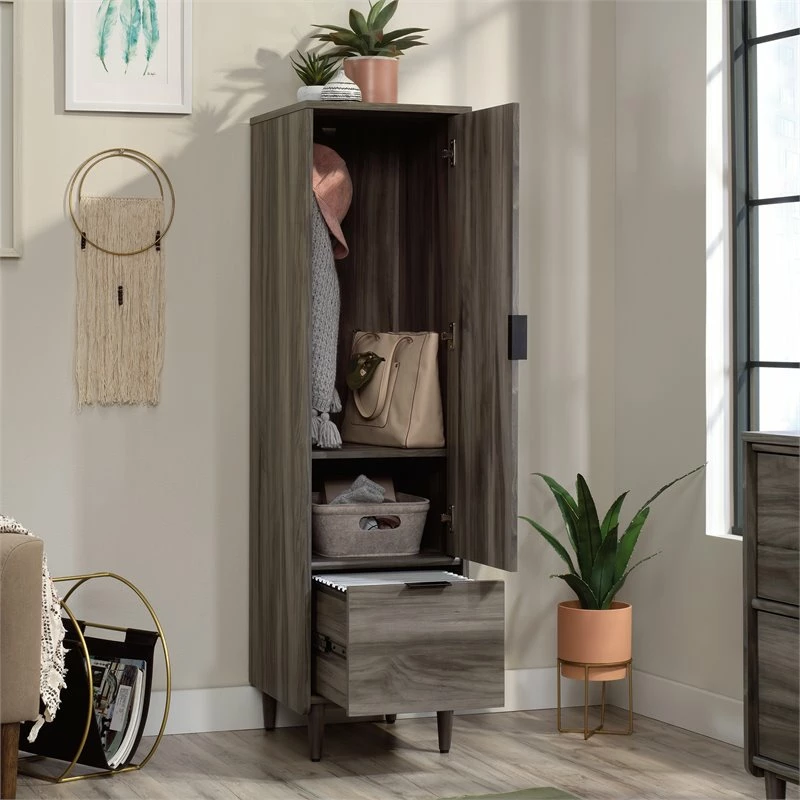 Traditional storage spaces are drab and predictable. With this vertical storage cabinet from the ® collection, the storage possibilities are endless. This storage cabinet with file drawer features an adjustable shelf behind door to customize your cabinet to your liking. Hidden storage is perfect for items like books, folders, seasonal décor, extra chargers, board games, and more! This storage cabinet with door also features a file drawer with full extension slides that holds letter-size hanging files, so all your most important documents are easy to find. Finished on all sides for a polished look from any angle, storage file cabinets, like this one, can be positioned from any angle and still look polished—no unfinished edges here. With solid wood feet detailing and a Jet Acacia™ finish, this home office storage unit provides a variety to traditional storage options. We hope you like what you see. Home Square designers travel the world and bring back the best and latest in style, finish, and color trends. This inspiring world travel is evident in the cutting edge and innovative furniture solutions we offer to you!