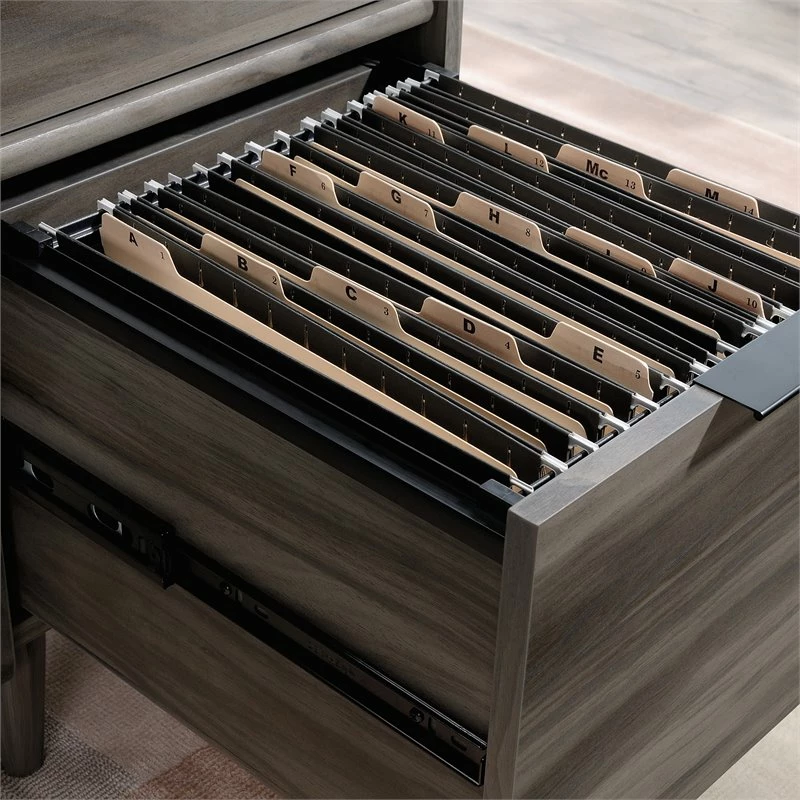 - Two (2) file drawers with full extension slides hold letter-size hanging files