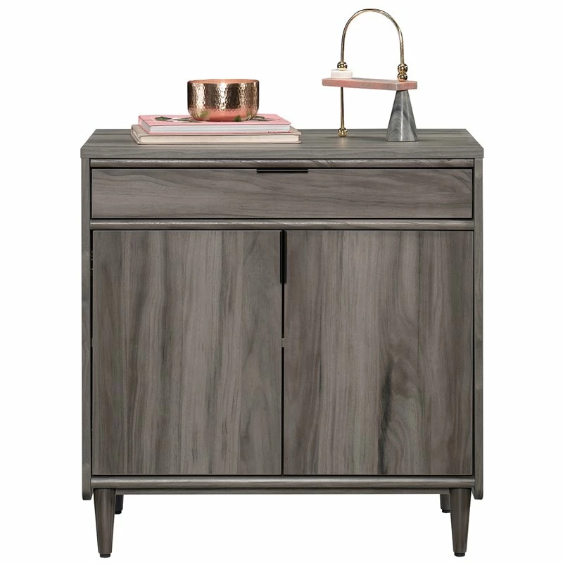 This library base cabinet from the ® collection brings various storage options to one sleek unit. A storage drawer with full extension slides makes this two-door base cabinet the perfect place for storing pens, chargers, sticky notes and more. The hidden storage behind the door features a large adjustable shelf to provide flexibility and accommodate items of various heights. You’ll never have an issue finding a place for that oversized book, storage for your printer, or somewhere to stash your books and binders. This base storage cabinet features a grommet hole with pass-through for cord management for your printer, a lamp, your cell phone charger and more. Finished on all sides for a polished look, this library storage cabinet will look great from every angle. Solid wood feet and a Jet Acaciaâ„¢ finish make this 2-door storage cabinet stylish and sturdy. For a midcentury modern design, look no further this this library cabinet.