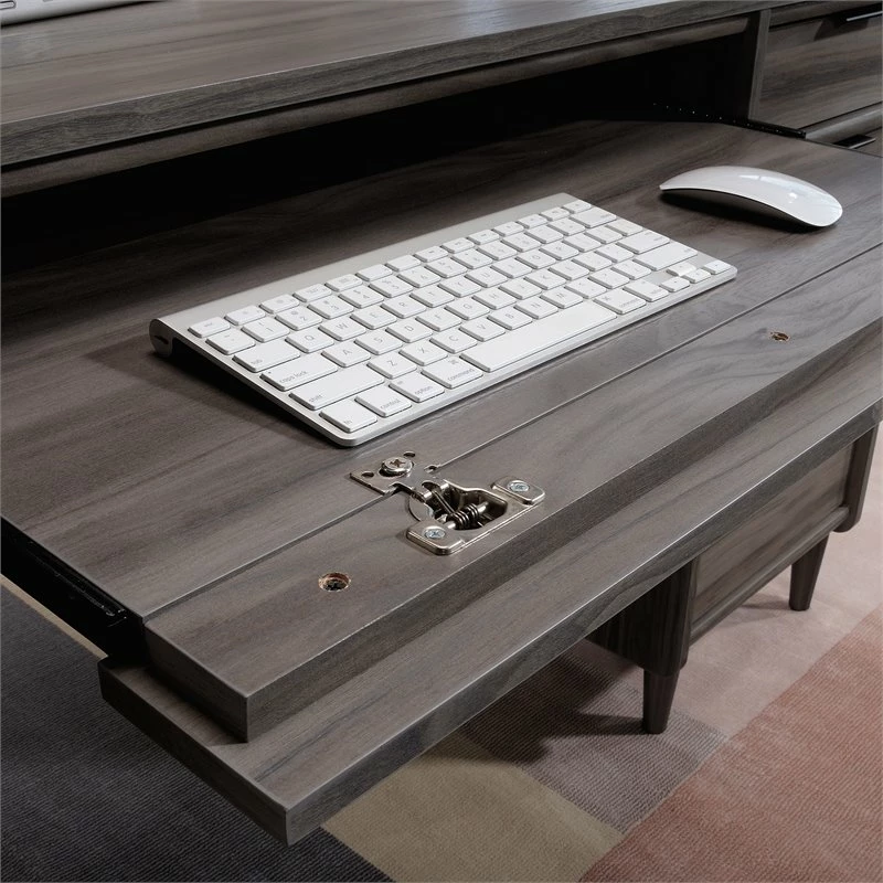 Stately and professional. This executive desk from the ® collection is an elegant centerpiece to your home office. A large drawer/shelf features a flip-down panel for keyboard/mouse, so the top surface of your pedestal desk is clutter free and has enough room for your computer, lamp, and cup of coffee. Mid-century modern desks, like this, are just as functional as they are stylish—this computer desk with storage includes two file drawers with full extension slides that hold letter-size hanging files. Four additional storage drawer feature metal runners and safety stops, so you will never run out of places for your sticky notes, pens, chargers and more in this executive home office desk. Desktop grommet holes for electrical cord access prevent a tangled mess of chargers or power cords. Solid wood feet and a Jet Acacia™ finish are the chic details that you look for from a beautiful executive home office desk.