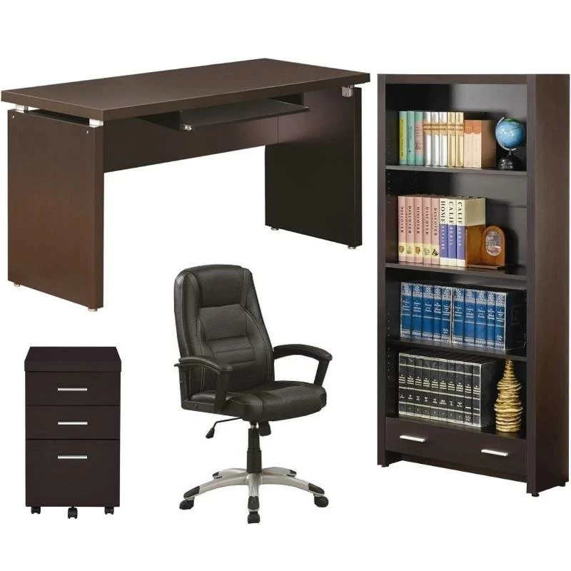 Smooth and clean-lined, the Skylar collection offers transitional style office furniture. A sophisticated cappuccino finish covers the bookcase of this collection. Four shelves offer ample open storage for holding your office supplies. An unexpected extra offering can be found in the single drawer at the bottom of the bookcase. With contemporary, silver drawer pulls, this drawer is a great place to store paper or other small office items.