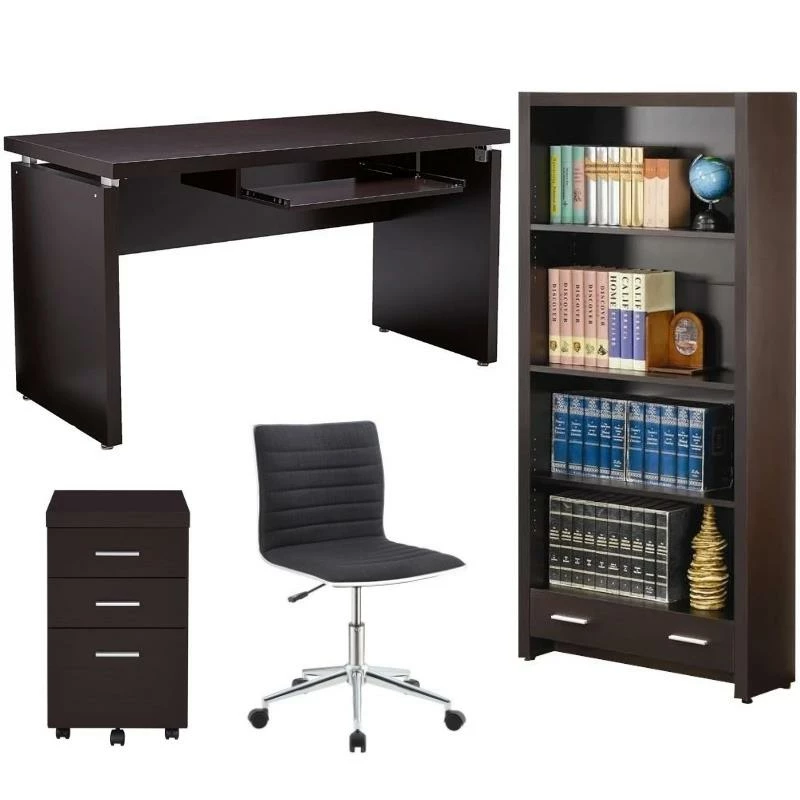 Smooth and clean-lined, the Skylar collection offers transitional style office furniture. A sophisticated cappuccino finish covers the bookcase of this collection. Four shelves offer ample open storage for holding your office supplies. An unexpected extra offering can be found in the single drawer at the bottom of the bookcase. With contemporary, silver drawer pulls, this drawer is a great place to store paper or other small office items.