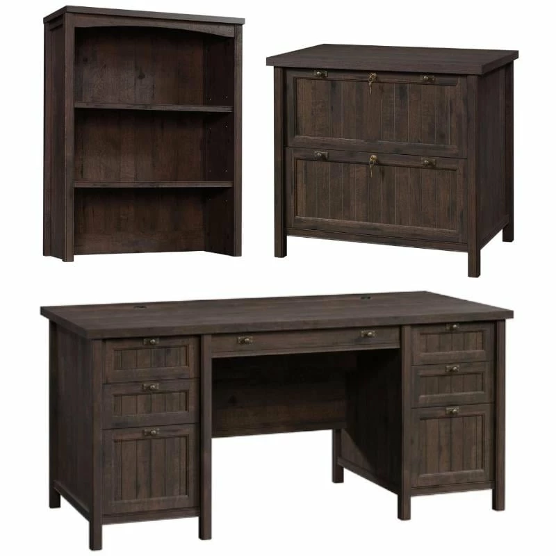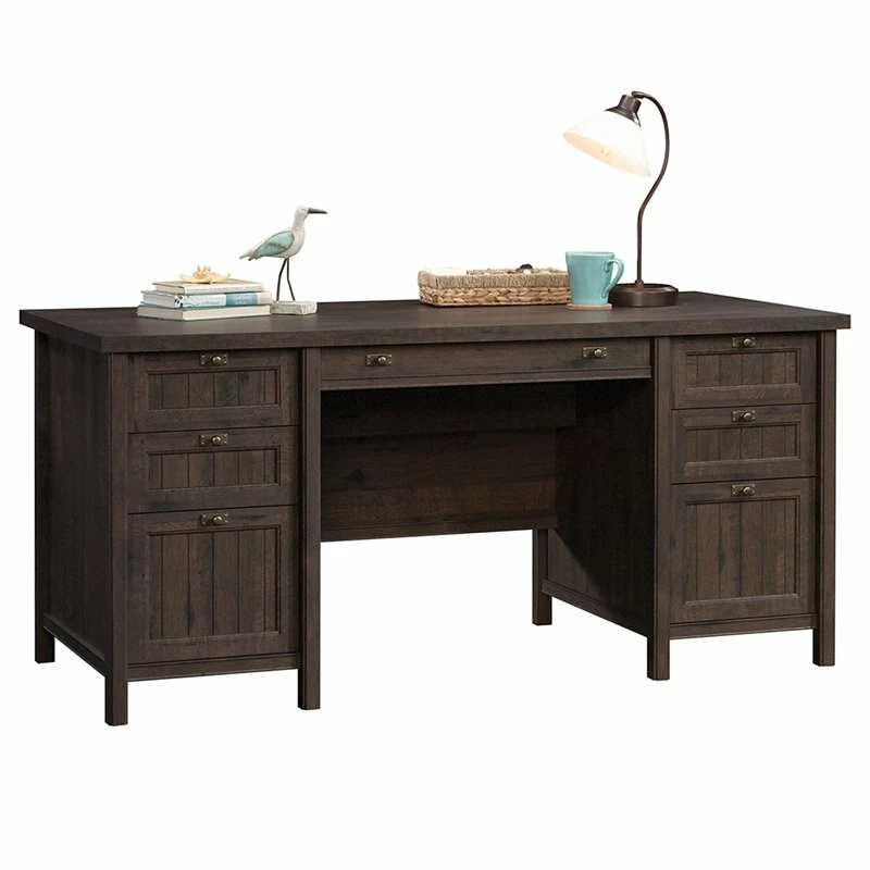 Give your home office or workspace a promotion of a lifetime with this executive desk from the Costa collection. This cottage-inspired desk features a durable, 1″ thick tabletop that provides you with ample amount of room for all your office essentials – laptop, a collection of notepads, a cup full of pens and of course your favorite coffee mug. It features a large pencil drawer along with four easy access storage drawers that open and close on smooth metal runners. These drawers create a convenient space to stow away all your miscellaneous office items. The two lower drawers with full extension slides accommodate letter or legal size hanging files so you can keep all your important documents and files organized. It also features a cord management system with two desk top grommet holes so you can keep all your wires neat and out of sight. Finished in coffee oak and detailed with framed, slat-front drawers, this beautiful executive desk gives your office space the coastal vibe you’ve always wanted.