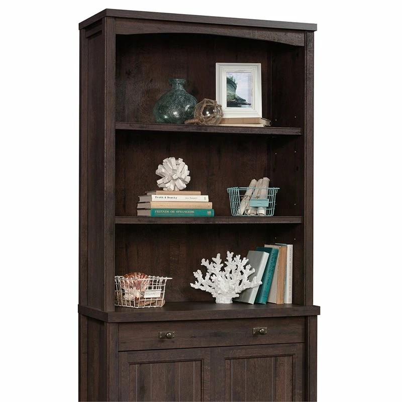 Add a little extra style and storage to your home office or workspace with this library hutch from the Costa collection. This cottage-inspired hutch features two adjustable shelves that are ideal for storage and display. These two spacious shelves move to different heights to accommodate items of all different shapes and sizes. They make a great spot for storing all your office essentials like books, binders and folders or for displaying home décor items, awards and your most prized possessions. This handy storage hutch attaches to library base 422981 or lateral file 422975 to give your office or workplace a completed look. Finished in an eye-pleasing coffee oak, this handsome hutch adds style, functionality and makes the perfect statement piece for your office. We hope you like what you see. Sauder designers travel the world and bring back the best and latest in style, finish, and color trends. This inspiring world travel is evident in the cutting edge and innovative furniture solutions we offer to you.