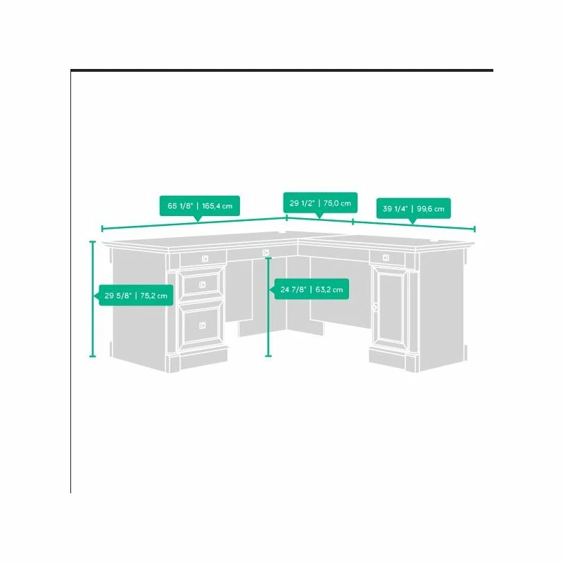 Creating a stylish space to get some work done has never been easier thanks to this L-shaped desk from the ® collection. It features a drawer/shelf with a flip down panel for your laptop or keyboard/mouse, a file drawer with full extension slides to hold letter or legal size hanging files, three additional drawers for storage, desktop grommet holes, and a storage area behind the door that can hold a vertical CPU tower and has an adjustable shelf. Absolutely loaded with features! Finished on all sides in Vintage Oak®, this desk will instantly class up your office.