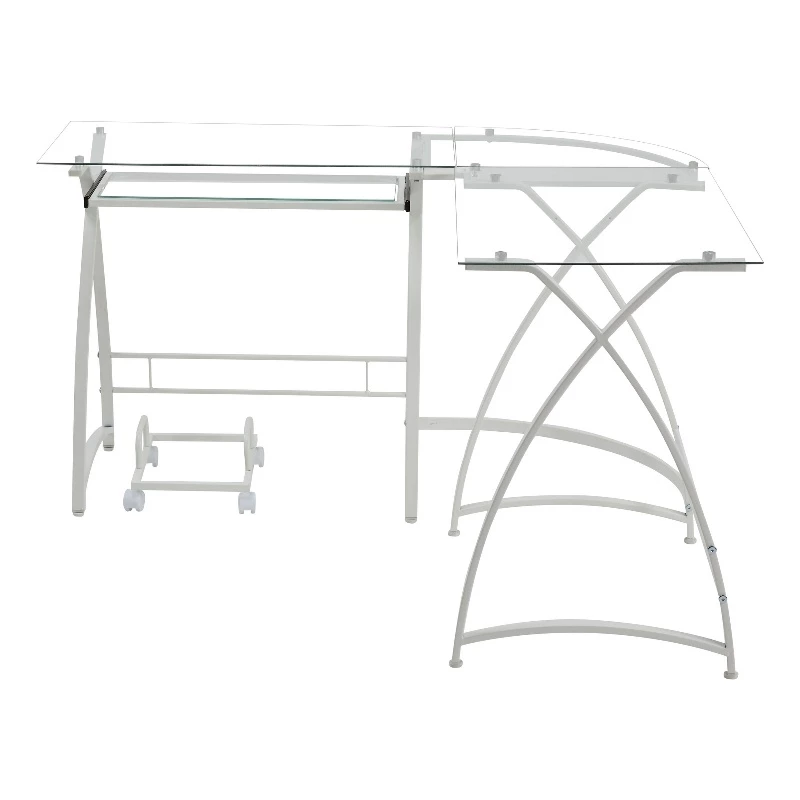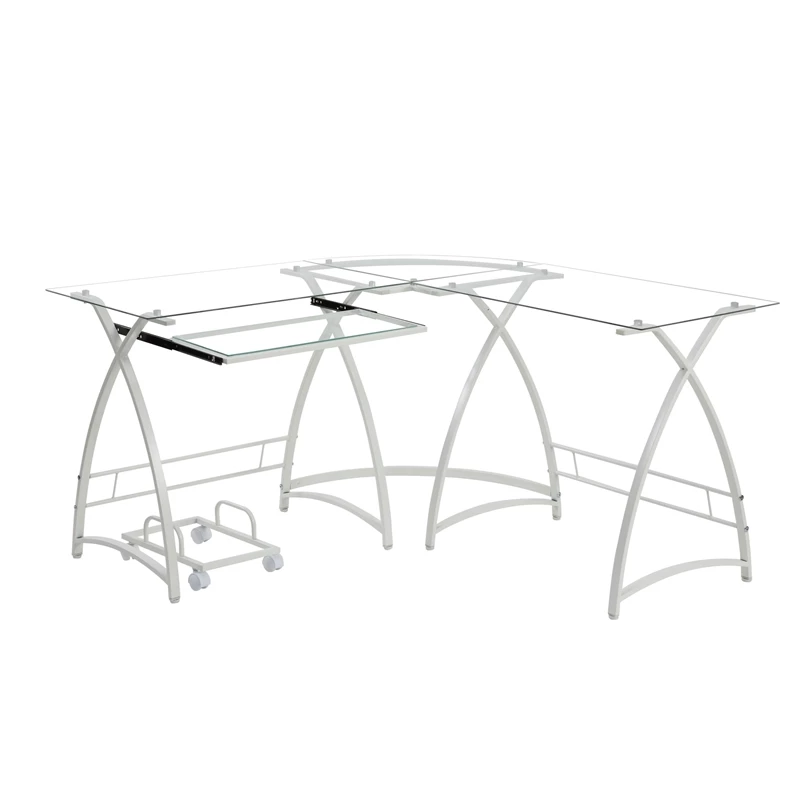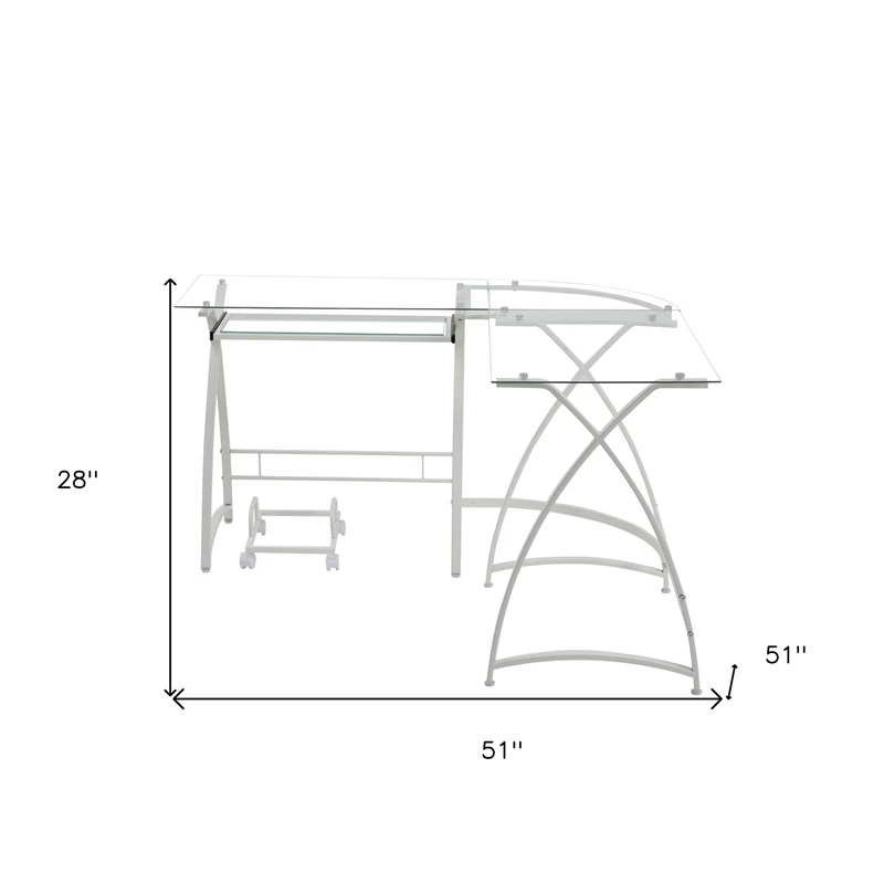 This 51″ clear glass and white metal l shape computer desk will help to turn your office space into an executive suite. The L shape adds surface space in a space saving way, making this a great option for a corner. Built to last, this sturdy desk is designed for comfort and efficiency for years to come. 28″ H x 51″ W x 51″ D