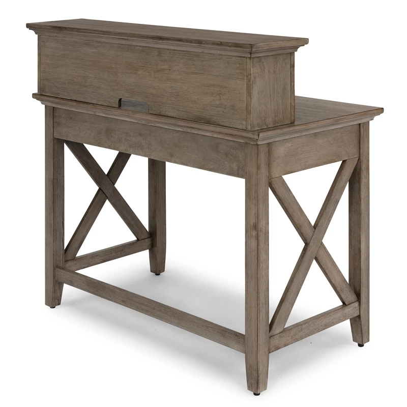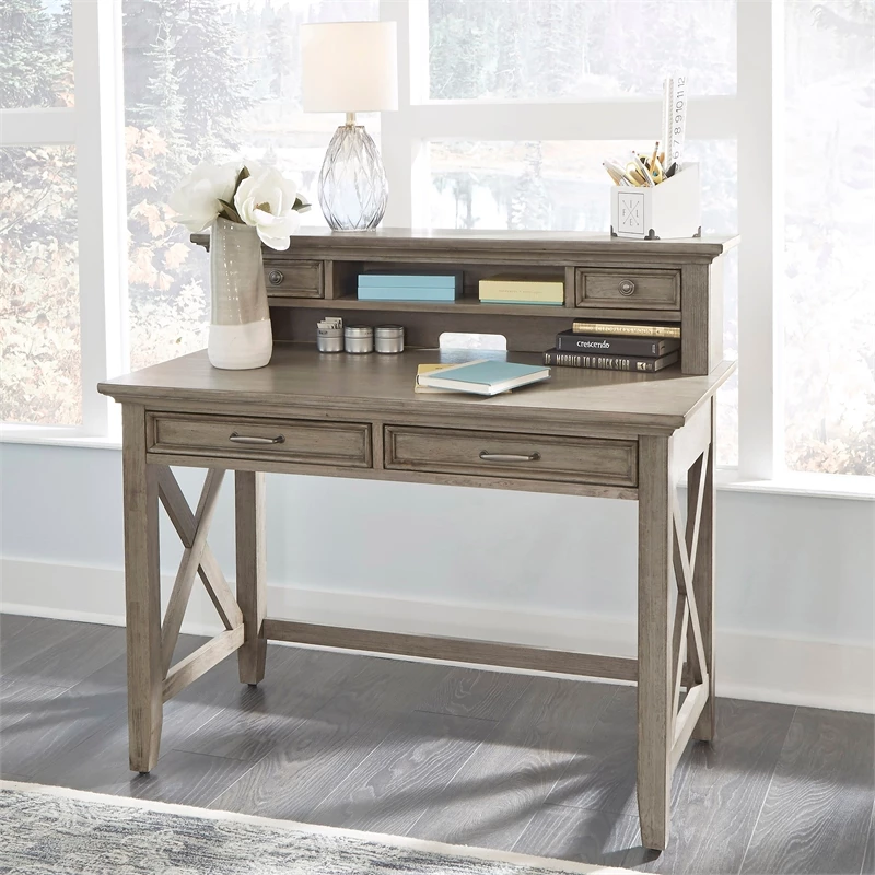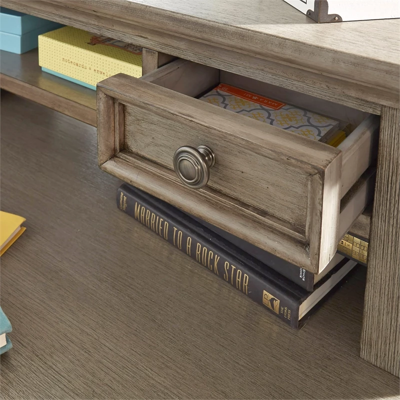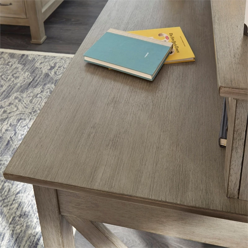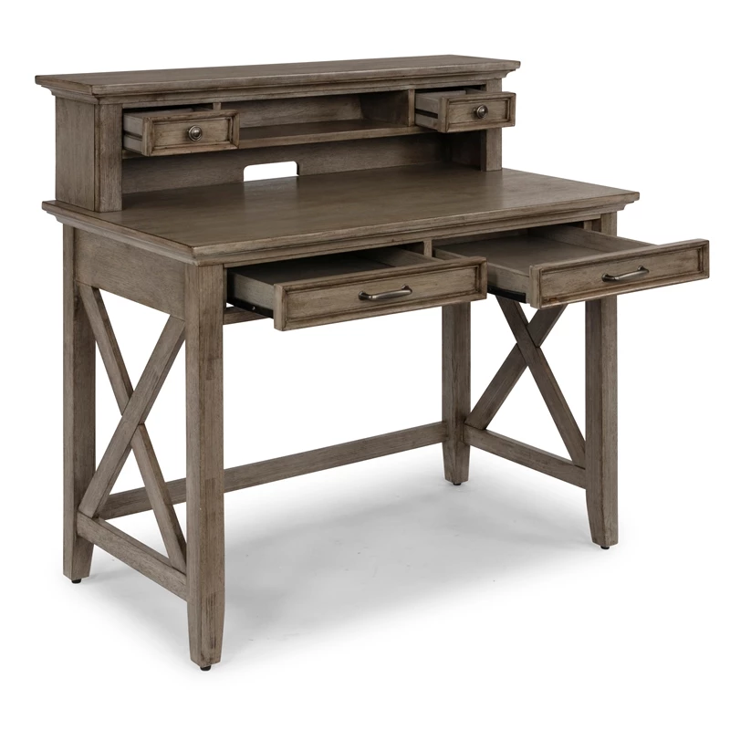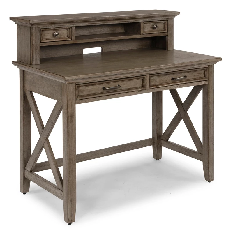 Rustic casual design that is at home in a mountain lodge, as it is in a mid-town loft. Crafted of hardwood solids and engineered woods, with wire brushed surfaces to provide a rough-hewn look. Finished in a multi-colored gray that provides unique high lighting to the design. Features 2 lap drawers with antiqued nickel finished drawer pulls. “X” frame design on the sides between the front and back legs, with lower stretcher bar support. Hutch features 2 outside accent drawers with center pigeonhole area for storage. Back panel features cut-out for cord access. Arrives to your door by parcel delivery service. Note finish and measurements may vary, assembly required.