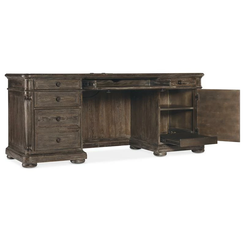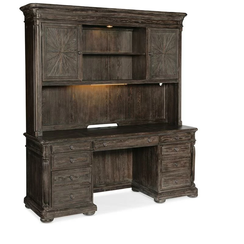Inspired by antiques and architecture of vintage character, the Traditions Computer Credenza has an aspirational yet inviting aesthetic. Crafted of Pine Veneers with a Solid-Wood Edge Top, the desk is finished in Maduro, a rich brown with grey undertones revealing the beauty of the woodgrain. There’s one wraparound door and one adjustable shelf and pullout printer tray behind the door. Features 5 drawers, with the left and right top drawers each having 2 removable dividers. One pencil tray and one writing slide for use in either side. The center drawer has a drop-front for keyboard use with a wire cutout in the back of the drawer. The back panel is ventilated behind the right- side door. FC627 power outlet on top with two electrical outlets and two USB ports. Inspired by a two-week trip through Europe in search of architecture and antiques full of vintage character, Hooker Furniture introduces the Traditions Collection. Targeting a design-oriented consumer with a sophisticated style, the whole home collection – one of the largest in company history – uses familiar forms to present a nostalgic, yet comfortable aesthetic. Layered with fresh elements, the group offers an updated presentation that speaks to a storied past, yet easily transitions into today’s interiors.