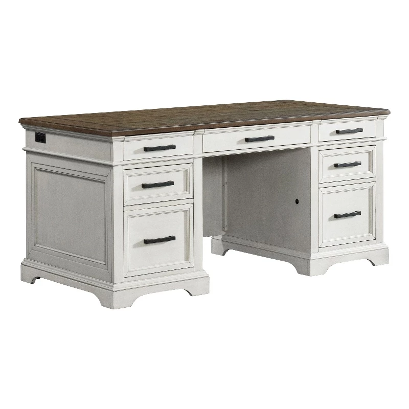 Drake Home Office offers a classic old world style, all case pieces have rustic oak plank board tops. This two-toned finish combines a relaxed antiqued white finish with warm rustic oak patina. Solidly constructed and designed to function the way we work today.