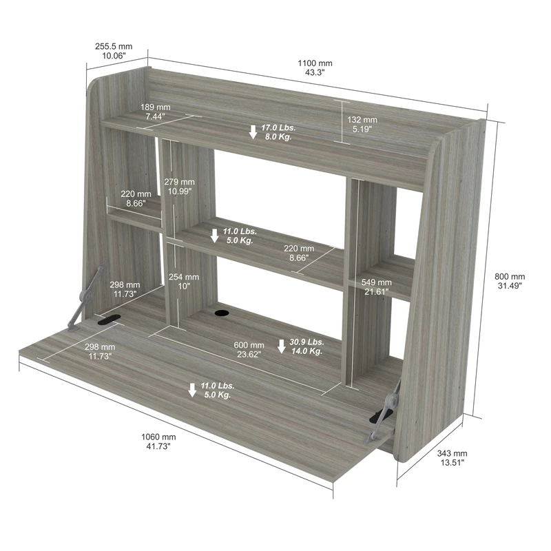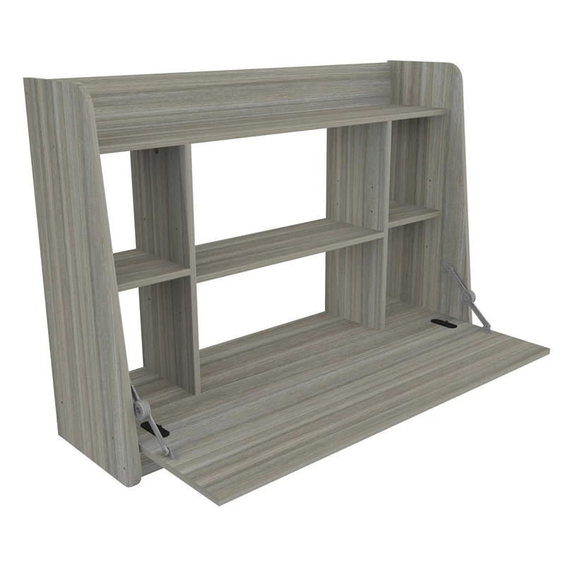 Inval America Wall Mounted Floating Desk finished in a rich gray “Smoke Oak” laminate in durable melamine which is stain, heat and scratch resistant and is constructed from manufactured wood. This fashionable desk is the ideal remedy for your home or office compact desk needs. It features a fold down desktop with plenty of room for your laptop and other desk accessories. Six various size shelves which deliver lots of storage space for books, files, picture frames, and other décor accessories. At the end of the day the desktop folds into the wall mounted floating unit converting it into a wall unit for displaying your decoration Chair, laptop and decorative accessories are sold separately and not available through Inval America. Assembly and installation required.