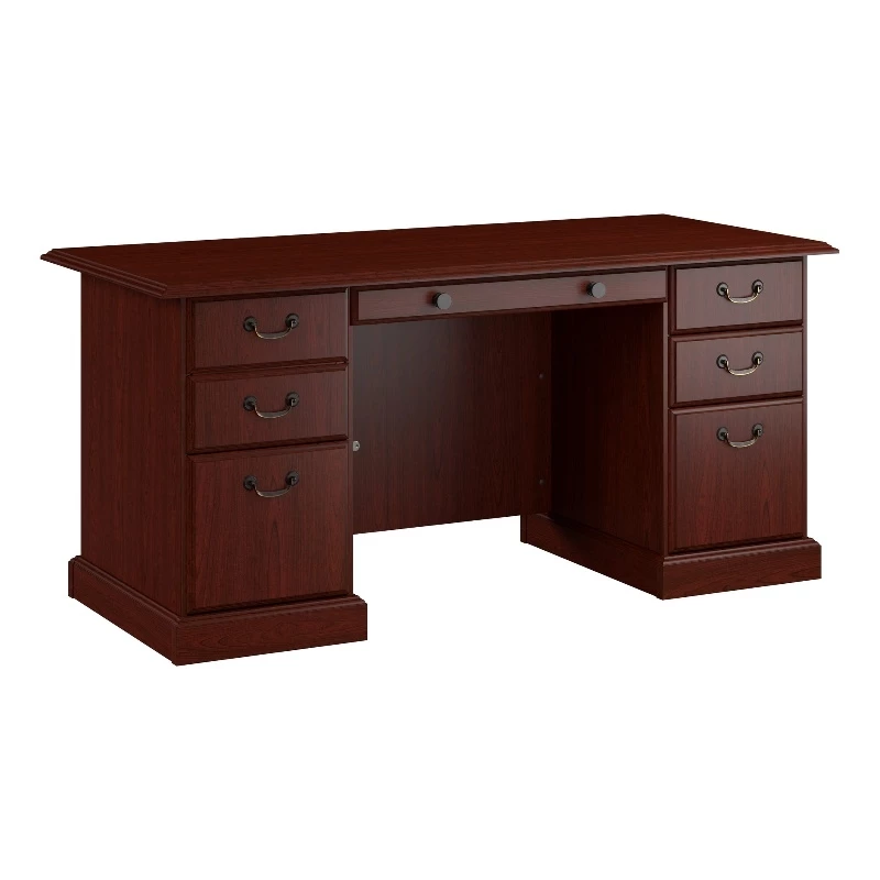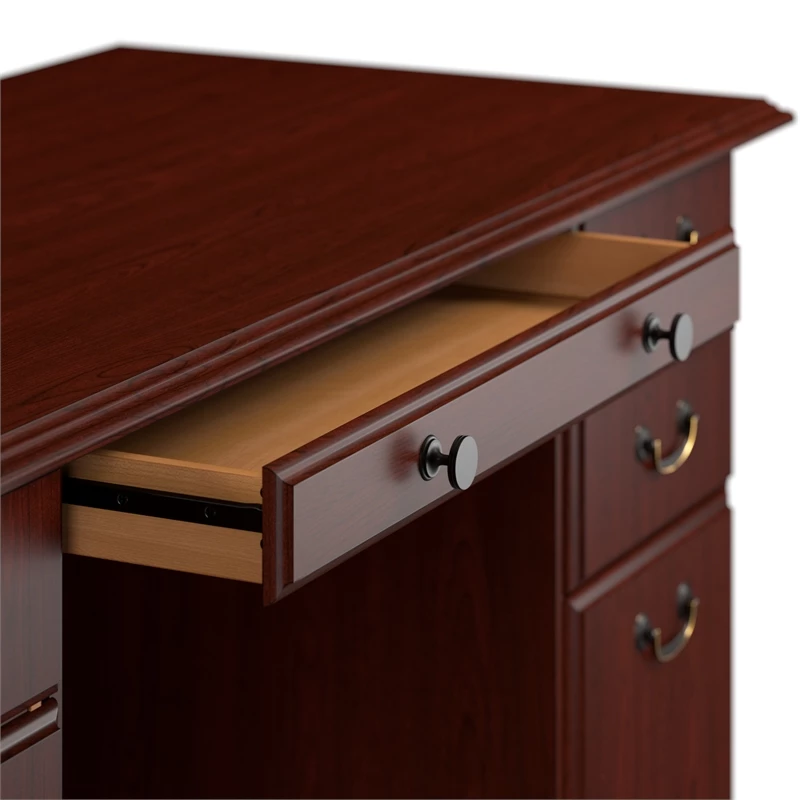 Add a sense of timeless style and tradition to your home or workspace with the Bennington Credenza from kathy ireland® Office by Bush Business Furniture. The rich Harvest Cherry finish, antique brass accents and decorative detailing provide a classic look you’ll love for years. Spread out and work comfortably, this product features a generously sized work surface constructed of thermally fused laminate for incredible durability and resistance to scratches and stains. The convenient, wide pull-out keyboard shelf frees up valuable work surface space. Double pedestal design includes two box files for general supplies and two concealed storage compartments with an adjustable/removable shelf inside. Compartments also feature a wire pass through slot making it a perfect spot for CPU or other electronic devices. Built to last, this product meets ANSI BIFMA furniture standards for safety and performance backed by a 6 year warranty. For classic styling with old-world charm choose the Bennington Credenza. And for a total office solution, see the full Collection for coordinating items available.