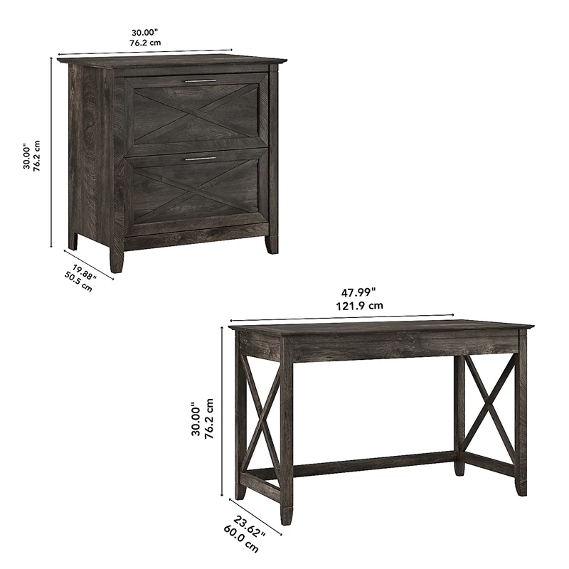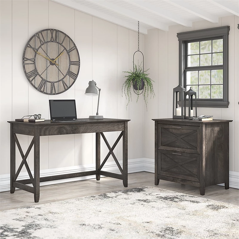 A natural fit for homes that embrace coastal and farmhouse decor, the Bush Furniture Key West 48W Writing Desk with Lateral File Cabinet creates a comfortable and spacious feeling, even in compact areas. This 48W x 24D small computer desk provides plenty of room to spread out with a laptop and paperwork while boasting a weight capacity of 200 pounds. The lateral filing cabinet matches the Writing Desk’s height for an extended work surface when placed side by side. Two file drawers open on smooth full-extension ball bearing slides for easy access to your legal and letter size documents. Unique X pattern accents and sturdy, attractive post leg designs help give this furniture set a relaxed and airy feel. This small desk with drawers set is tested to meet ANSI/SOHO quality standards for safety and performance and is backed by the Bush Furniture 1 Year Manufacturer’s Warranty. Materials: Engineered Wood and metal hardware