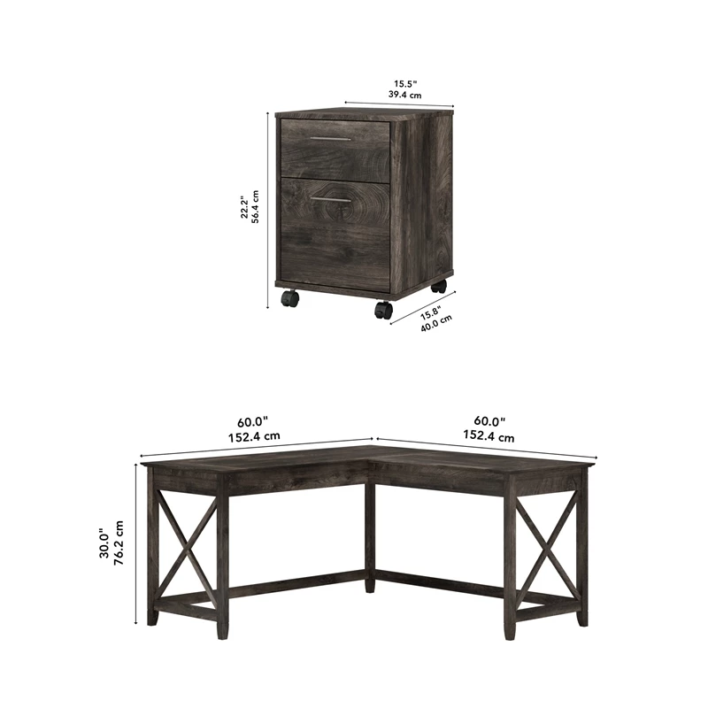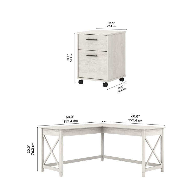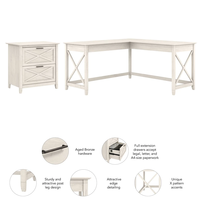 The Bush Furniture Key West 60W L Shaped Desk with Lateral File Cabinet turns any room into a practical home office with easy going style. At 60W x 60D, the durable work surface is spacious enough to spread out with a computer, paperwork and more when taking on your task of the day or just browsing the web. A sturdy post leg design and thoughtful construction with quality materials give the L shaped computer desk a weight capacity of 200 pounds. The 2 drawer filing cabinet opens on smooth full-extension ball bearing slides for an easy reach to legal and letter size documents. Unique X pattern accents on side panels of the L Desk and the Cabinet’s file drawers create a relaxed appearance that blends seamlessly with coastal and farmhouse decor. This desk with drawers set is tested to meet ANSI/SOHO standards for safety and performance and is backed by a 1 Year Manufacturer’s Warranty.