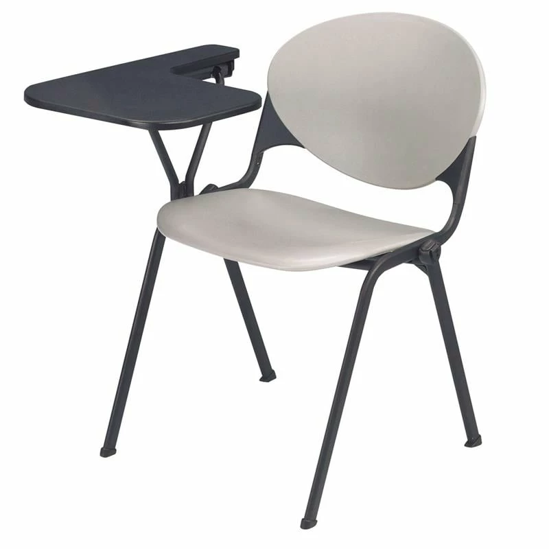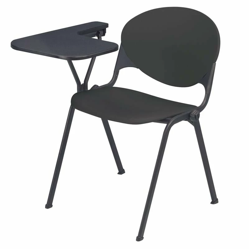 - 20.8″D x 14″W P-Shaped writing tablet that flips up so chairs can be stacked.