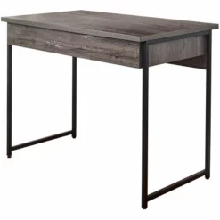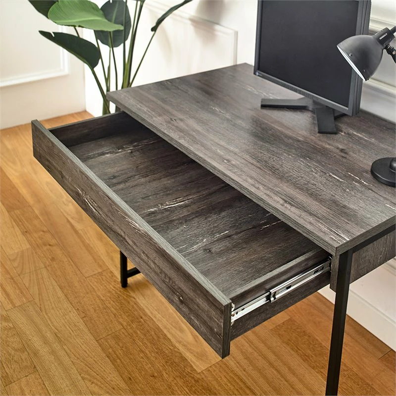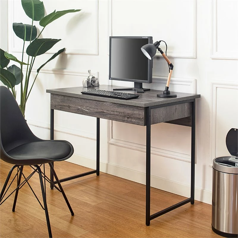 A versatile wood desk suitable for work and hobbies comes with a spacious tabletop. Find a large storage drawer equipped to conceal an array of belongings, ranging from stationary to notebooks and more. A streamlined yet bold metal frame in black provides support and a touch of airy appeal.