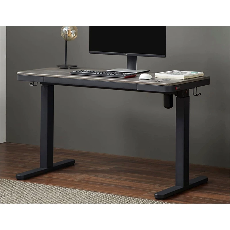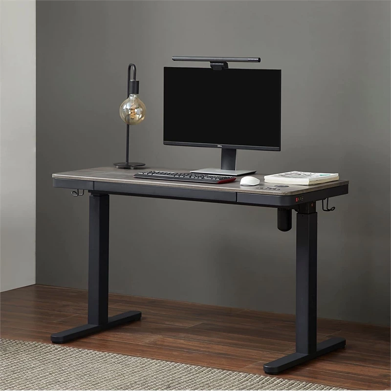 Working can be hard on your back when you are sitting at a desk for 8 hours a day. Update your workspace and break up those long periods of sitting with this innovative, electronic standing desk. Easily transition from sitting to standing with just a light touch on the LED control panel integrated into the desktop. The height may be adjusted to anywhere between 28 to 48″ via a smooth-operating electronic motor. Freely adjust the height anywhere in that range and then save your favorite height preferences with the three programmable height settings that remember your ideal sitting and standing positions. To avoid accidentally adjusting the height, simply lock and unlock the touch controls by pressing the lock button located on the side of the desk. The side of the desk also includes two built-in USB power ports to simultaneously power up your devices at once at full speed. Enjoy all these benefits in a sleek, modern style with the standing desk’s slimline design that features a wooden desktop as well as a full extension drawer with build-in organizer for supplies.