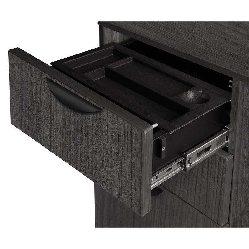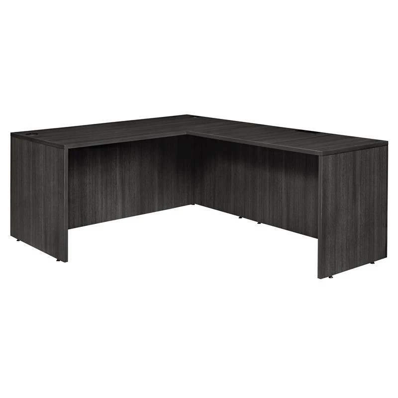 Legacy desk shells are the framework for a complete office. Customize with pedestals, hutches or other storage options. This classic L-shaped corner workstation includes a 35-inch return which can be installed on either side of the desk. Wire management grommets keep cables clear of work areas. Adjustable glides on the bottom of the base keep the desktop level and are easy to adjust. Finished in an stylish Ash Grey laminate, this desk shell coordinates with other Legacy furniture. The Legacy collection is constructed of a 1-inch thick thermal fused melamine laminate with a 3-millimeter commercial grade matching PVC edge. Laminates are scratch, stain and scald resistant. Legacy casegoods are backed by a 10-year limited manufacturer’s warranty.