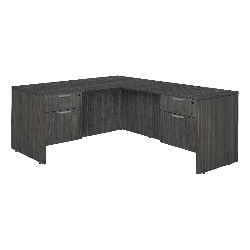 Versatility is just the beginning with so many Legacy desking options. This classic L-shaped corner desk is a great choice for professional and home offices alike. It comes with two box-file pedestals that each have one box drawer and one file drawer that accepts both letter and legal filing. All drawers lock and include ergonomically designed drawer pulls for convenience and ease in operation. Adjustable glides on the bottom of the base keep the desktop level and are easy to adjust. Wire management grommets keep cables clear of work areas. Finished in an stylish Ash Grey laminate, this desk coordinates with other Legacy furniture. The Legacy collection is constructed of a 1-inch thick thermal fused melamine laminate with a 3-millimeter commercial grade matching PVC edge. Laminates are scratch, stain and scald resistant. Legacy casegoods are backed by a 10-year limited manufacturer’s warranty.