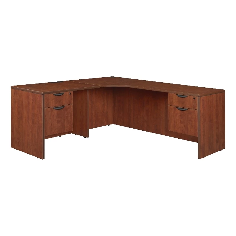 Versatility is just the beginning with so many Legacy desking options. This classic corner workstation has a curved center for a seamless transition between desk and return. On this Left Corner Credenza, the return attaches to the left hand side and it is not reversible. It comes with two box-file pedestals that each have one box drawer and one file drawer that accepts both letter and legal filing. All drawers lock and include ergonomically designed drawer pulls for convenience and ease in operation. Adjustable glides on the bottom of the base keep the desktop level and are easy to adjust. Wire management grommets keep cables clear of work areas. Finished in an stylish Cherry laminate, this desk coordinates with other Legacy furniture. The Legacy collection is constructed of a 1-inch thick thermal fused melamine laminate with a 3-millimeter commercial grade matching PVC edge. Laminates are scratch, stain and scald resistant. Legacy casegoods are backed by a 10-year limited manufacturer’s warranty.