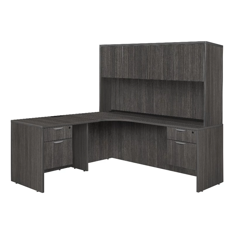 Versatility is just the beginning with so many Legacy desking options. This classic corner workstation has a curved center for a seamless transition between desk and return. On this Left Corner Credenza, the return attaches to the left hand side and it is not reversible. It comes with two box-file pedestals that each have one box drawer and one file drawer that accepts both letter and legal filing. All drawers lock and include ergonomically designed drawer pulls for convenience and ease in operation. The overhead storage hutch maximizes storage space without sacrificing kneespace or desk area. It has four doors that pivot on European style hinges and open to a spacious interior with plenty of room for binders, books, supplies or personal items. Adjustable glides on the bottom of the desk keep the desktop level and are easy to adjust. Wire management grommets keep cables clear of work areas. Finished in an stylish Ash Grey laminate, this desk coordinates with other Legacy furniture. The Legacy collection is constructed of a 1-inch thick thermal fused melamine laminate with a 3-millimeter commercial grade matching PVC edge. Laminates are scratch, stain and scald resistant. Legacy casegoods are backed by a 10-year limited manufacturer’s warranty.